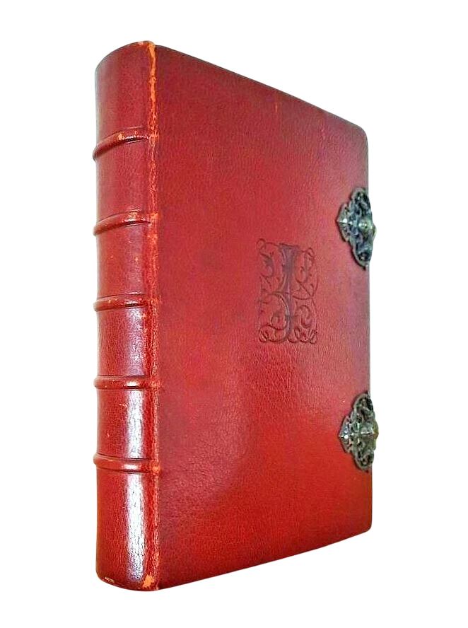 "Paroissien de la Reneissance"; Paris, Gruel Engelmann, 1883; Size of the book: 16 x 10,8 cm (6.3" x 4.25"); Brown Morocco leather binding with two metal clasps. Embossed stylised monogram to the boards. All page edges gauffered in gilt. Spine with five rised bands; Text in French; Collation complete - [6] blank pages, Engraved title page, 632 pages, [6] blank pages, with 8 full-page chromolithograph plates; Full leather binding is strong, tight and firm, overall in excellent condition, with some minor surface scuffings to the extremities. Metal clasps in excellent condition, fully functional and well preserved, with littla patina only. Pages/Text block in immaculate condition, clean and bright, no any marks or foxing throughout, except a few pages with a few negligible (light and small) foxing dots to the white margins. Overall the condition of the book is NEAR FINE.