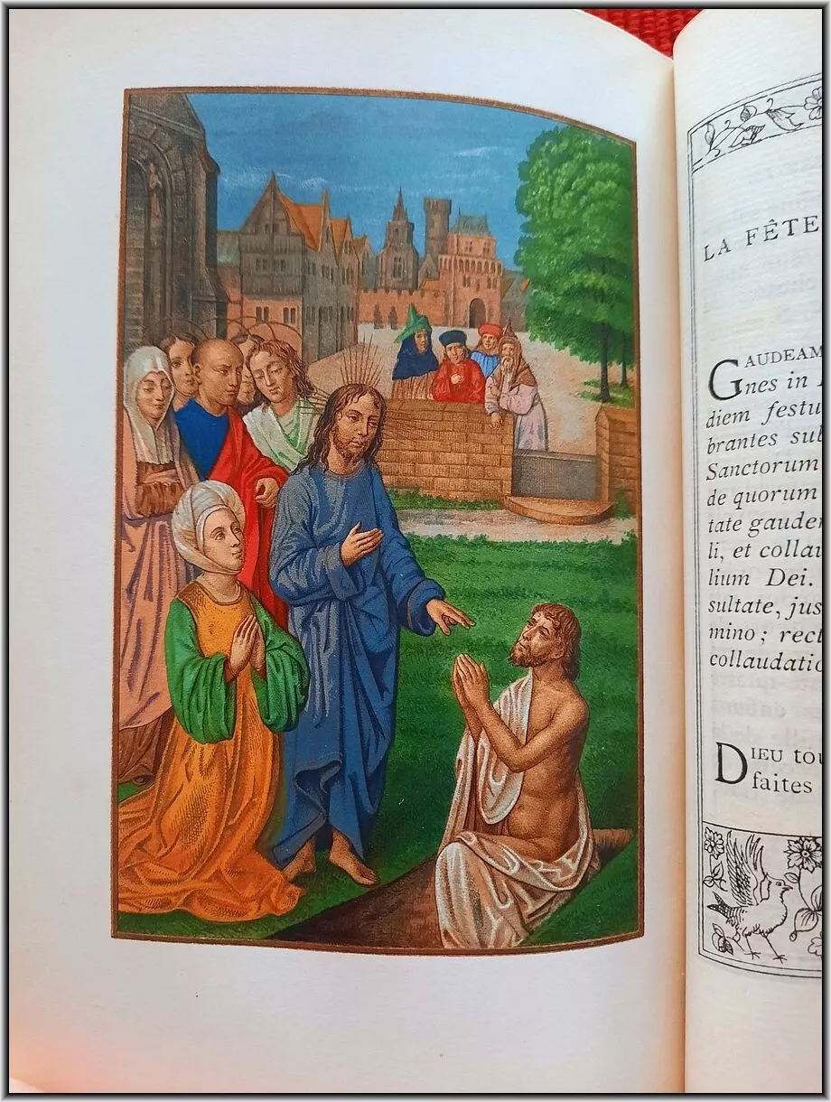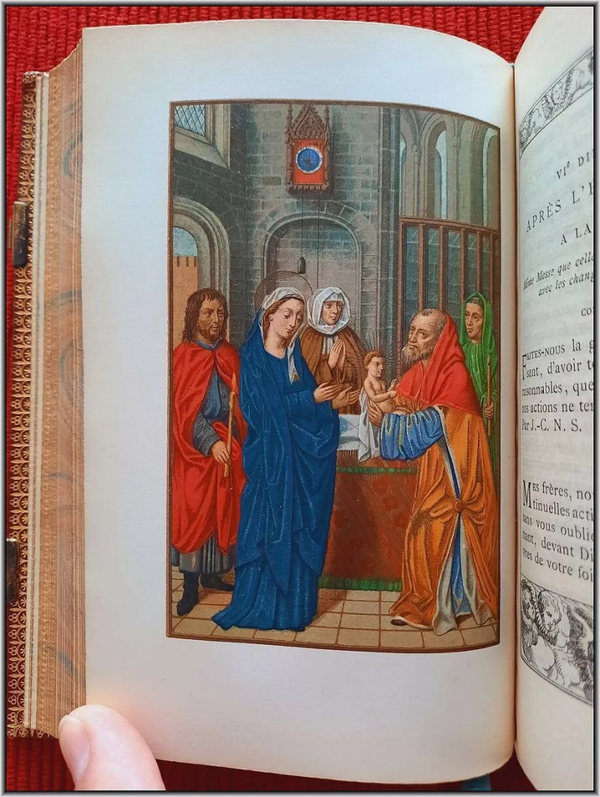 Richly illustrated with engraved title page and with 8 Chromolithograph engraved plates in Color & Gilt engraved by Ch. Walter. Superb illustrations in chromolithographies taken from Medieval Manuscripts and Books of Hours. All 632 text pages framed by different illuminated decorations designed by famous French engraver's house Moreau. Pages/text block from high quality paper by Blanchet freres & Kleber.