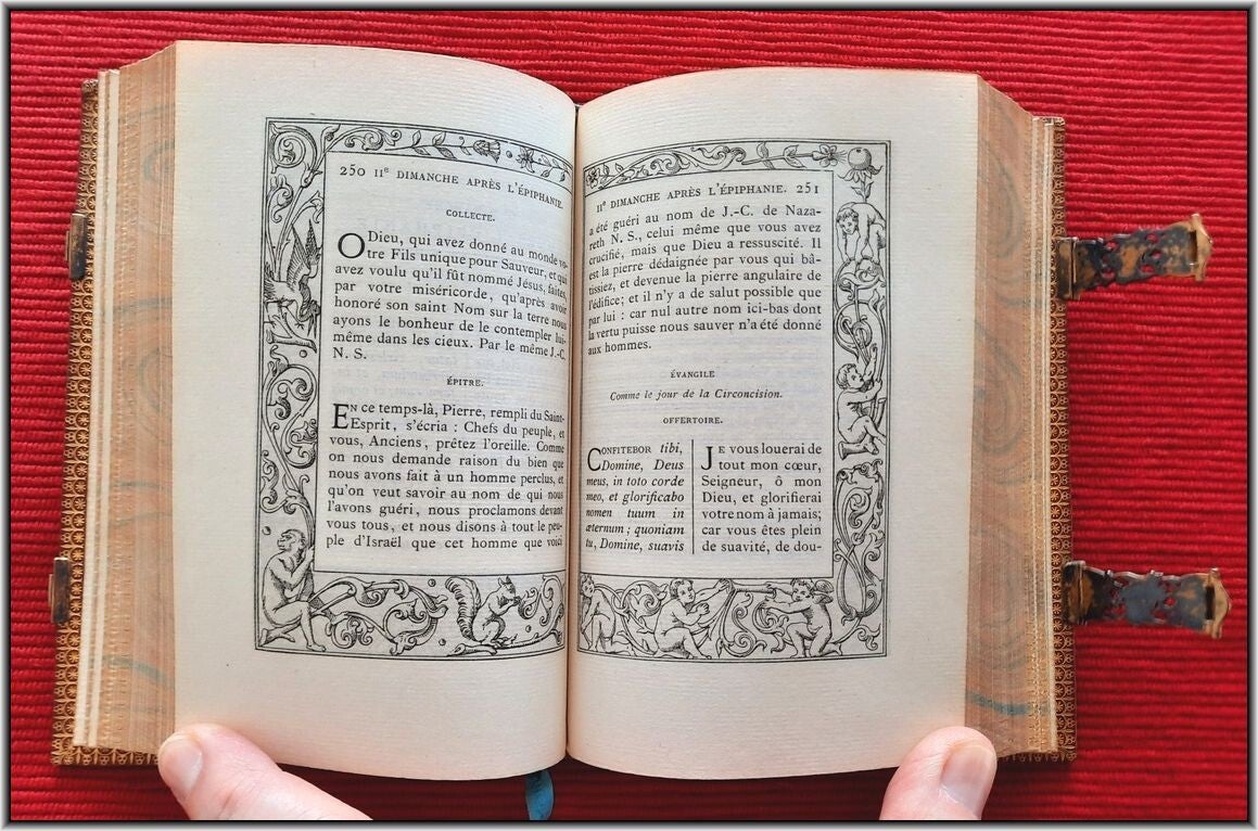 We are offering here an exquisite French Christian Catholic devotional book "Parishioner of the Renaissance" from 1883 with an unique leather binding. This richly illustrated and illuminated Christian work containing Morning Prayers, Evening Prayers, Ordinary of the Mass, Sunday Vespers, Antiphons of the Blessed Virgin Mary, Psalms of Penance, Prayers for Communion, The Holy Feast, Sunday Vespers, etc.
