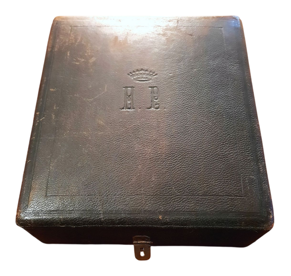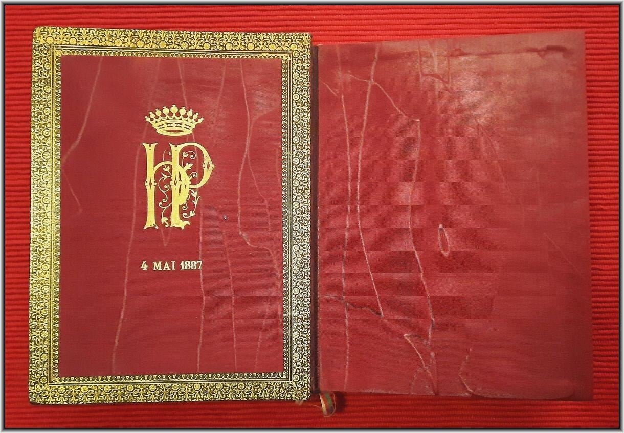 Bound in an unique brown Morocco leather binding with Fleur-de-Lys Symbols embossed in gilt to the boards and spine. Binding signed to the spine by Lesort. Very rich decorated front and rear paste-down with gilt frames and bordeaux Moirée silk. Free endpapers also accompanied by bordeaux Moirée silk. Stylised gilt monogram initials "H.P(ompery)" and gilt crown to the front paste-down. Sold together with an original custom-made wooden box with metal lock mechanism and red satin interior. Wooden box signed inside the box cover by famous French printing and publishing house Lesort. Monogram Initials "H.P(ompery)" with Royal Crown embossed to the box cover.