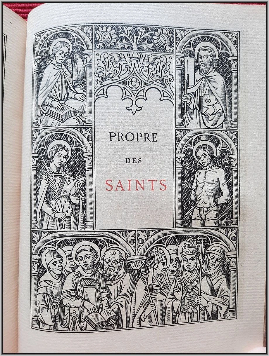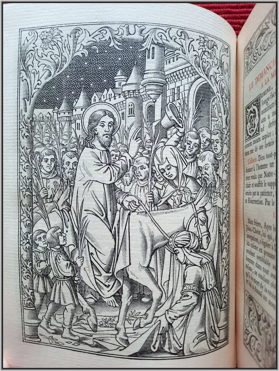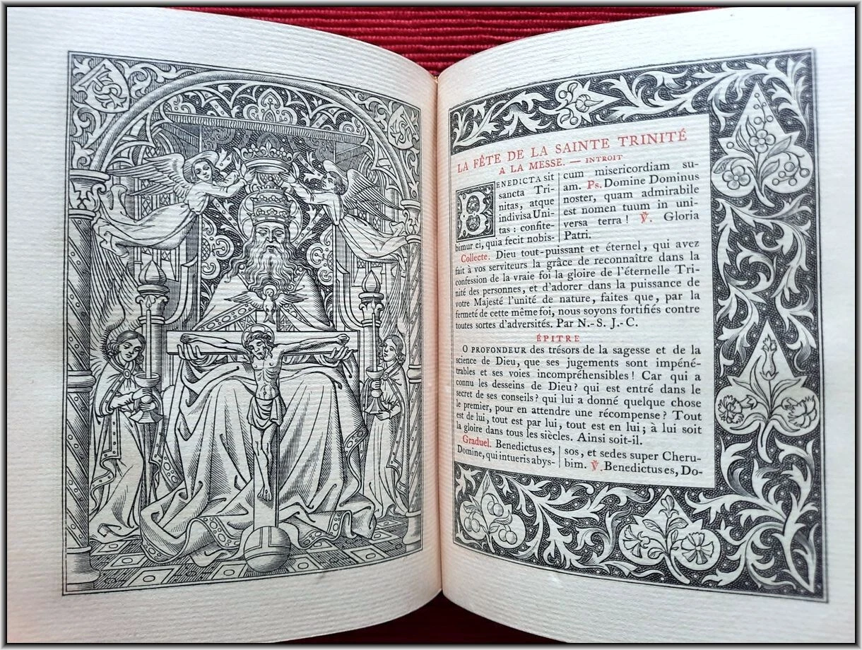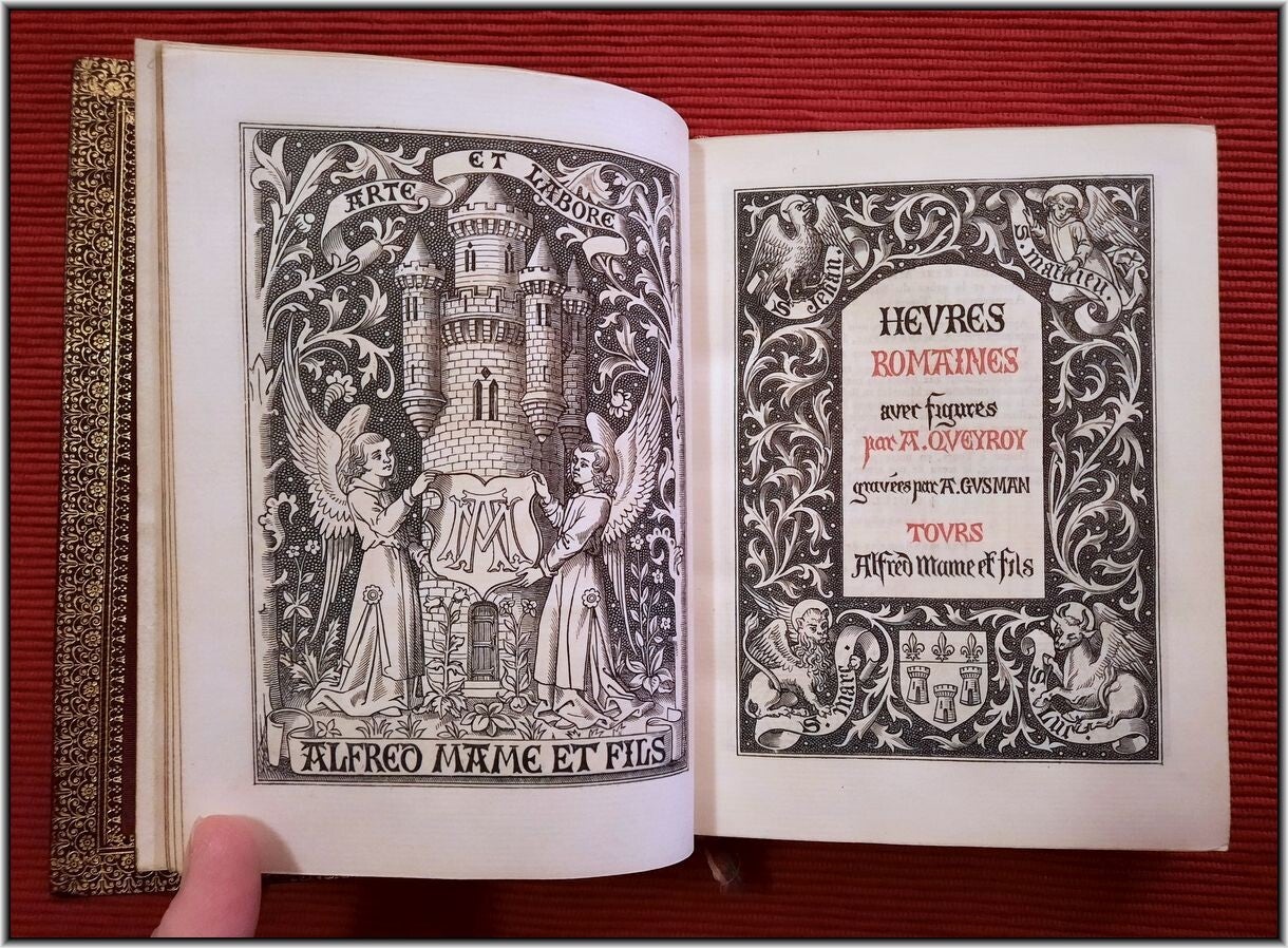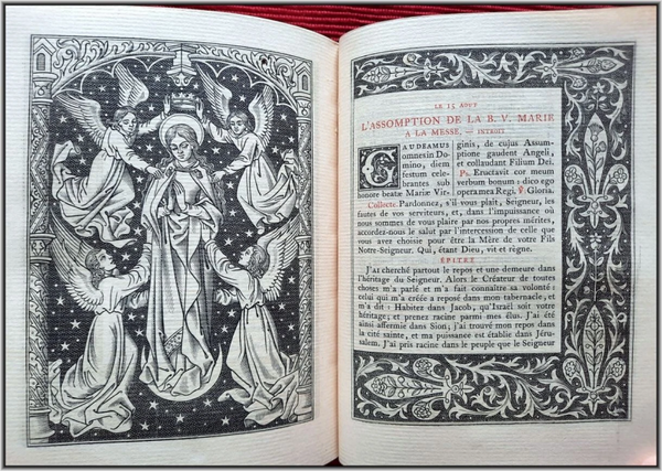 We are offering here a scarce Roman Catholic "Book of Hours" from 1885 with Frontispiece, Engraved title page, 25 engraved plates and 5 engraved chapter titles, plus an additional vellum front free endpaper with two Coat of Arms in Color & Gilt. All 516 pages richly illuminated and illustrated by famous French engravers A. Queyroy and A. Gusman. Pages/text block from high quality woven paper.