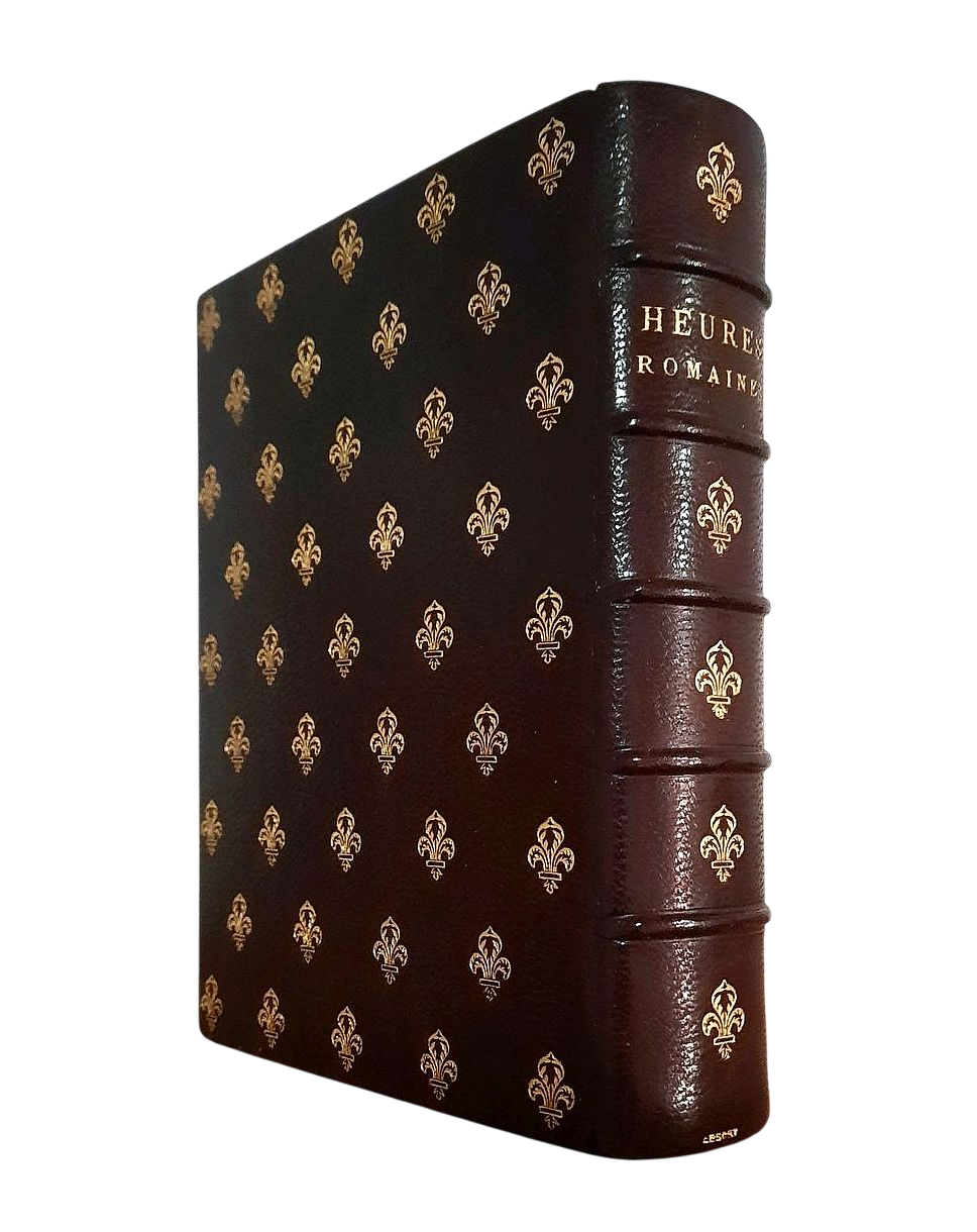 "Heures Romaines"; Tours, Alfred Mame et Fils, 1885; Size of the book: 15,8 x 12,5 cm; Size of the wooden box: 20 x 17,5 x 5,8 cm; Brown Morocco leather binding. Binding embossed by gilt Fleur-de-Lys symbols. Spine with five raided bands. Gilt title to the spine. All page edges gilt; Text in French; Collation complete - Vellum free endpaper with gilt & color Coats of Arms, [6], False title, Frontispiece, Engraved title page, [20], 516 pages, [8]; Full Morocco leather binding is tight and firm, overall in pristine condition, with insignificant wears/traces of use. Pages/Text block in also immaculate condition, clean and bright, no foxing or marks throughout. Overall the condition of the book is NEAR FINE. Wooden box is in very good condition, with some traces of use to the exterior, but whole, strong and stabile; interior is in excellent condition.