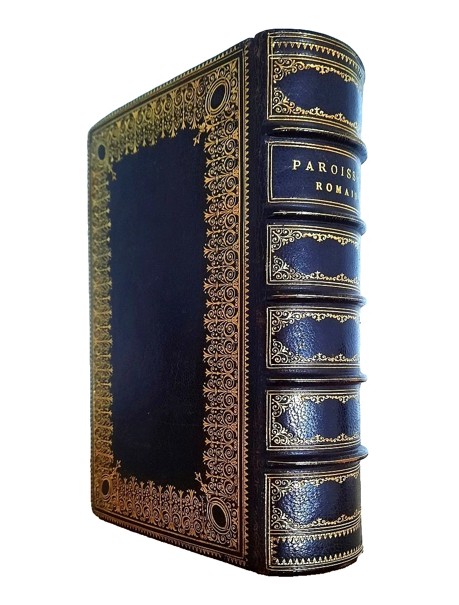 "Paroissien Romain Enlumine"; Dijon, Auguste Leroy, 1860; Size of the book: 15,5 x 11 cm (6.1" x 4.3"); Text in French; Brown Morocco leather binding with gilt ornamentation. Gilt title to the spine. Spine with five rised bands. All page edges gilt; Collation complete - Chromolithograph title page, Chromolithograph vignette-title, 504 chromolithograph pages, with 5 chromolithograph plates; Full leather binding is strong, tight and firm, overall in excellent condition, with negligible rubbing and discoloration and a few insignificant surface scratches. Pages/Text block in immaculate condition, clean and bright, no any marks or foxing throughout, only a few pages with a few small and almost invisible dark dots to the white margins. Overall the condition of the book is NEAR FINE.