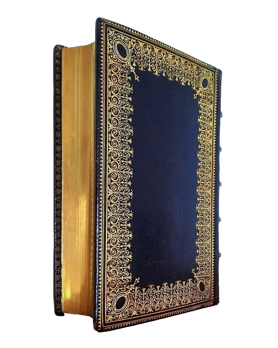 Bound in a brown Morocco leather binding richly addored by ornamentations in gilt. Richly decorated front and rear paste-down with gilt fleurons and tobaco Moirée silk. Free endpapers also accompanied by tobaco Moirée silk.