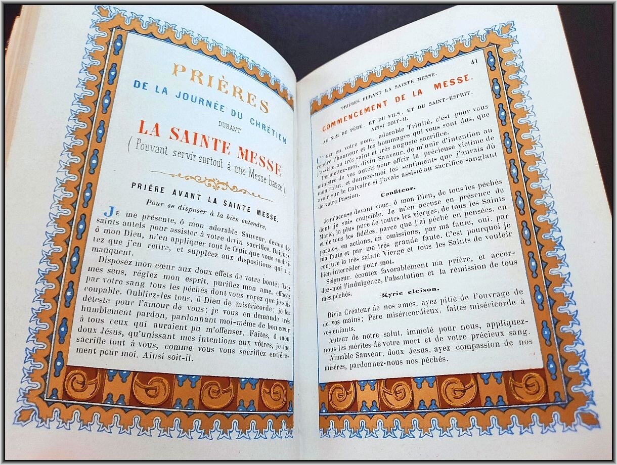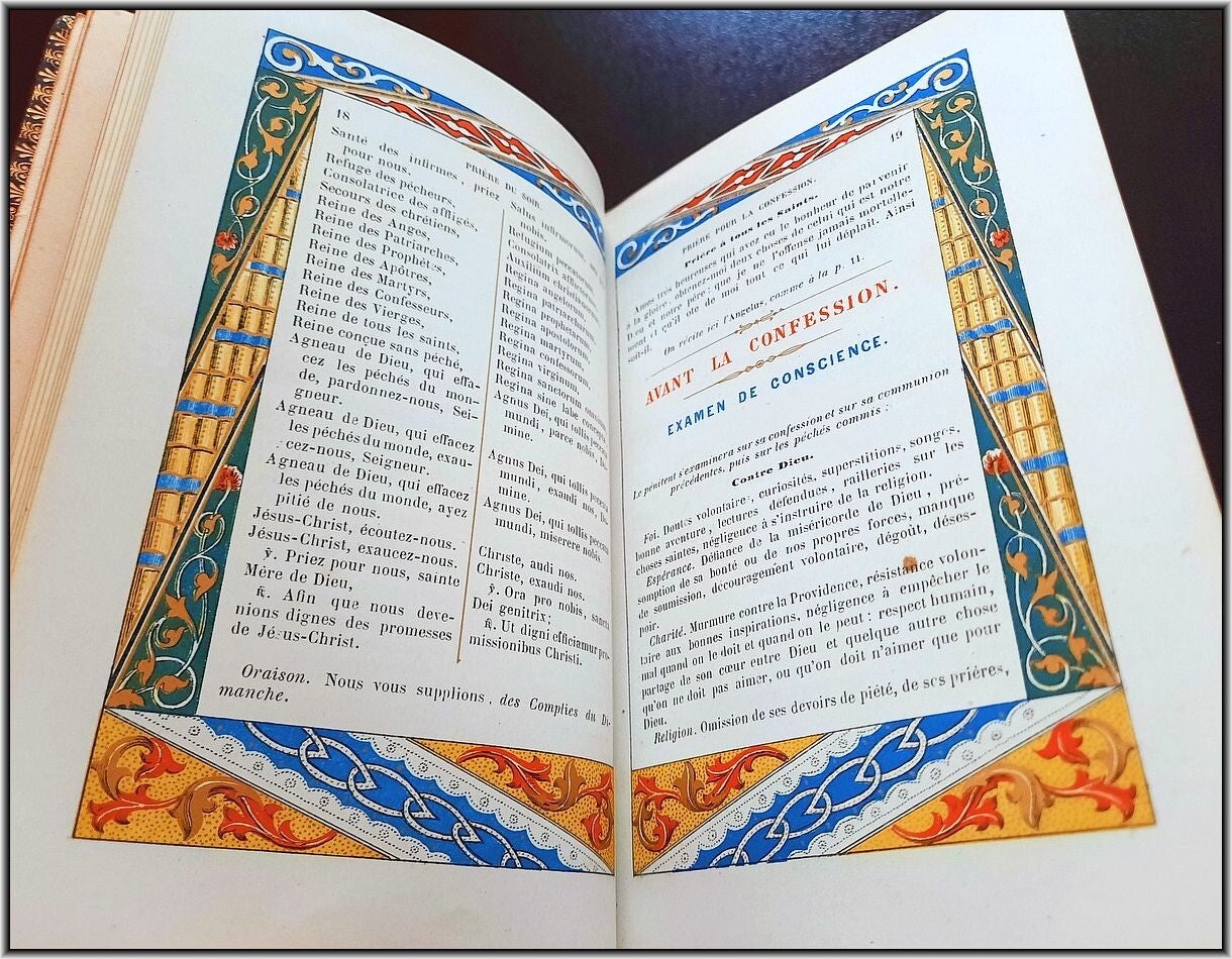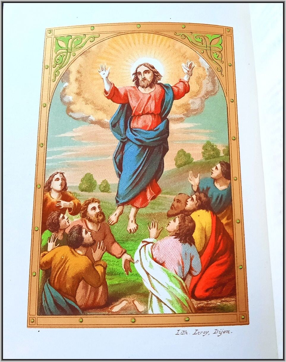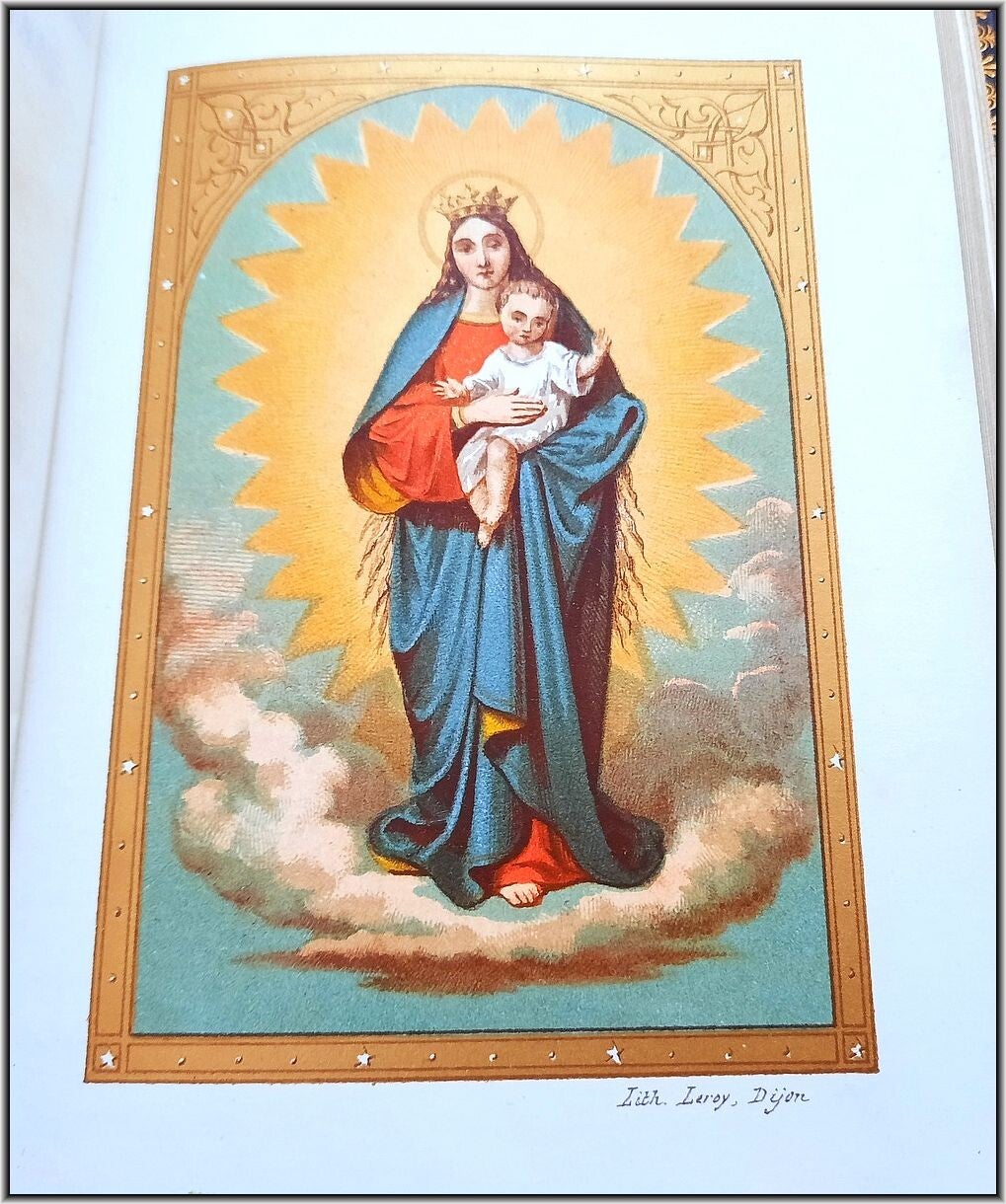We are offering here an exquisite French Christian Catholic devotional book "Roman Parishioner lluminates" published 1860 by Auguste Leroy (Dijon). This magnificant entirely chromolithographed work containing Morning Prayers, Evening Prayers, Prayers before the Holy Mass, Prayers during the Mass, Prayers for Confession, Prayers for Communion, Proper of the Saints, Common of the Saints, etc.