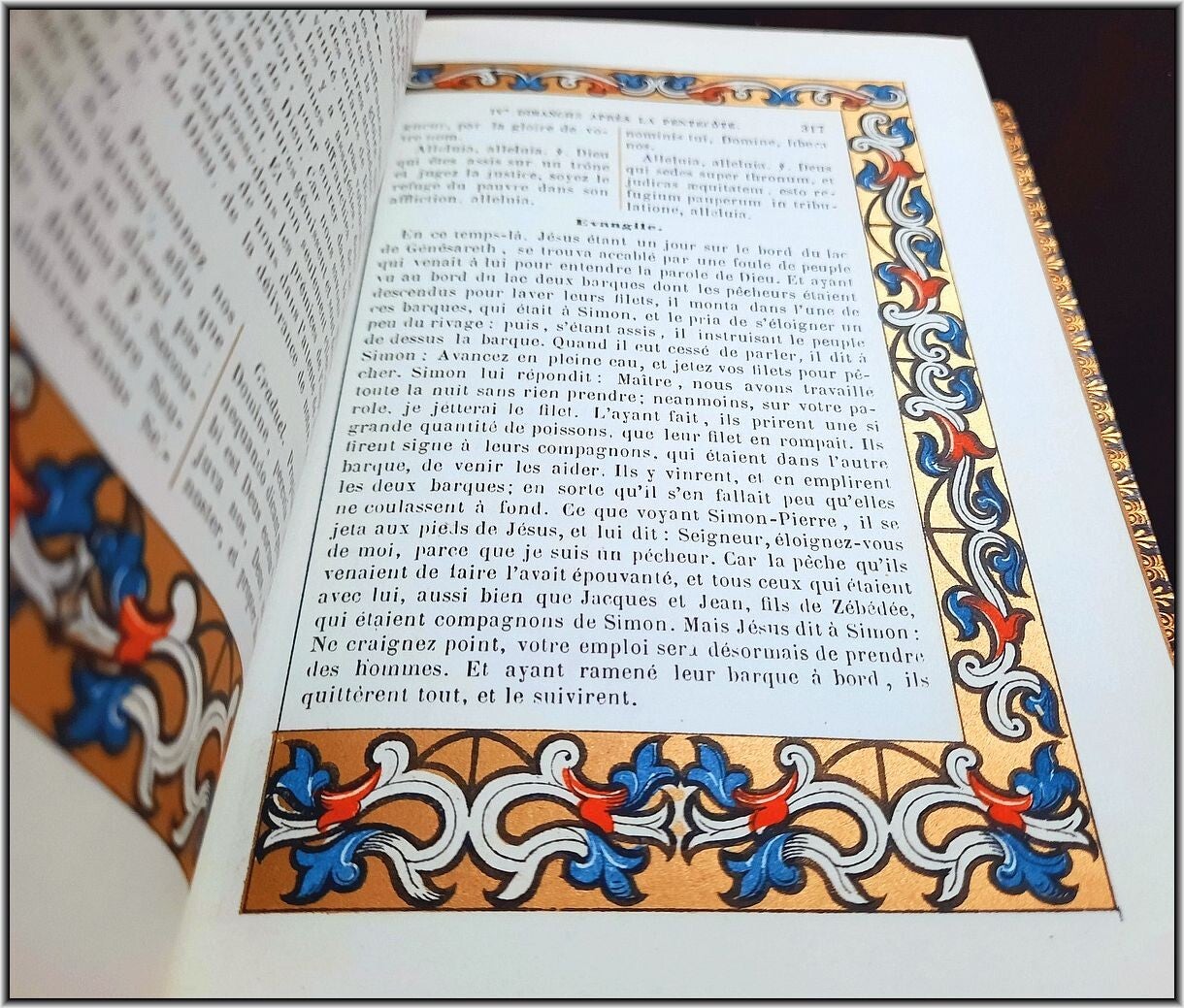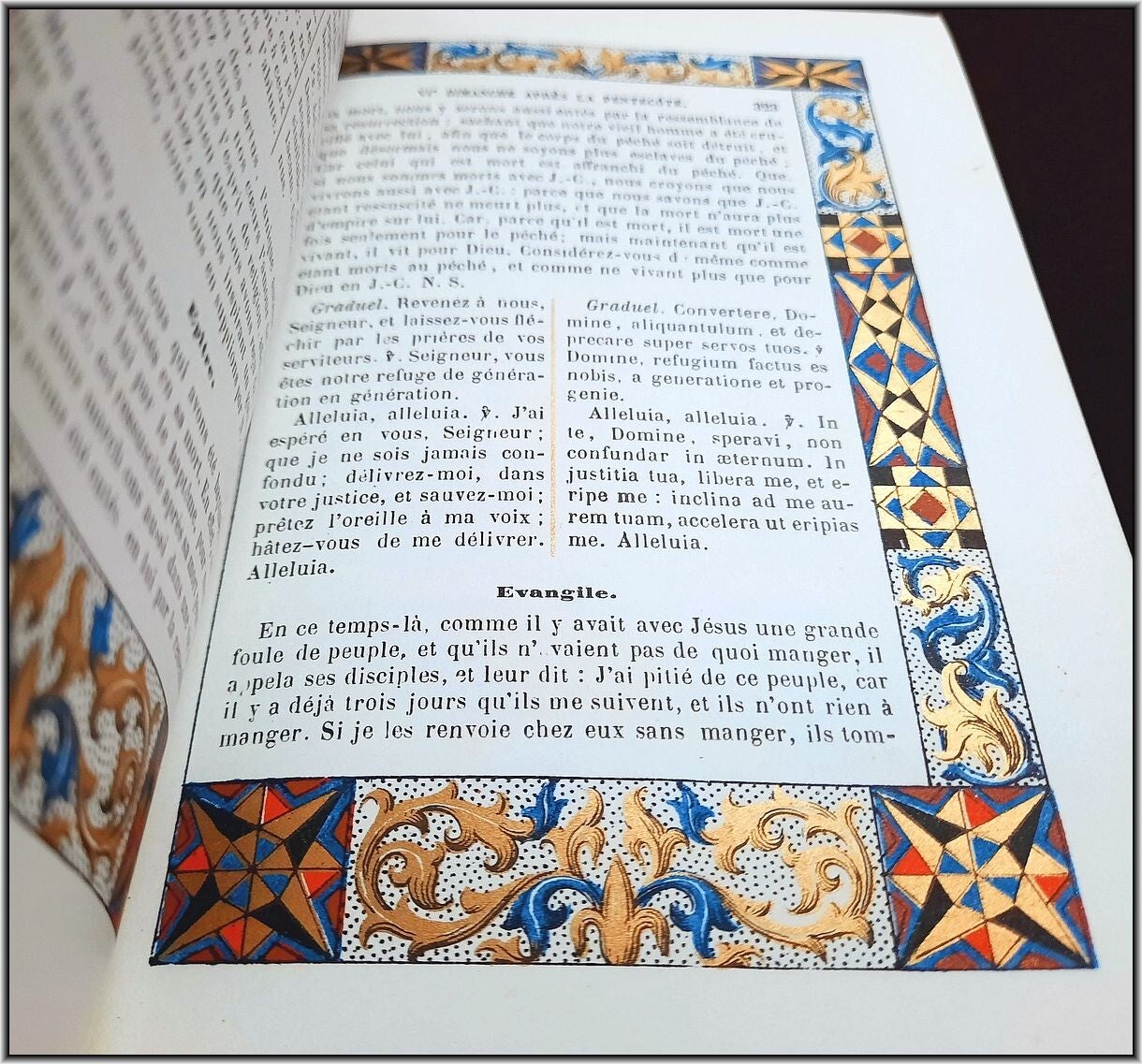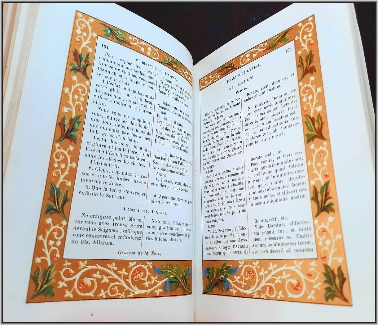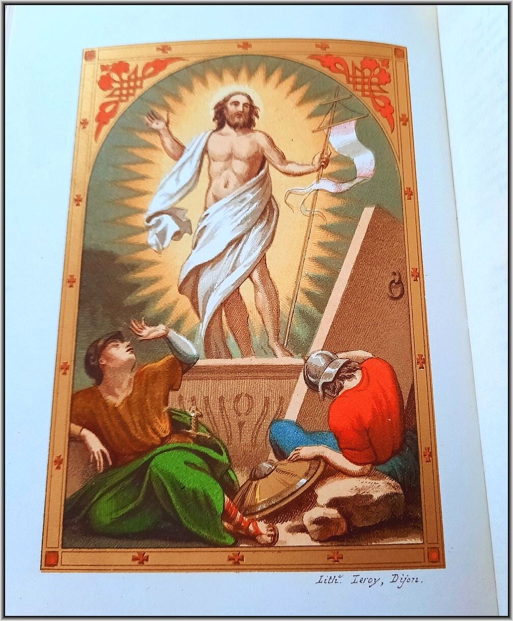 We are offering here an exquisite French Christian Catholic devotional book "Roman Parishioner lluminates" published 1860 by Auguste Leroy (Dijon). This magnificant entirely chromolithographed work containing Morning Prayers, Evening Prayers, Prayers before the Holy Mass, Prayers during the Mass, Prayers for Confession, Prayers for Communion, Proper of the Saints, Common of the Saints, etc.