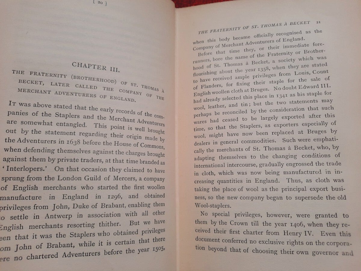 London & New York, Edward Arnold, 1896; First edition; Size of the book: 21 x 14,5 cm; Hardcover; Text in English; Collation complete - Coat of Arms of The Merchant Adventurers of England (1296), Title page, [xi], 329 pages, plus 32 pages of publisher's ads at rear dated June 1896; Ex-library copy, withdrawn from an university library. The binding actually feels strong, firm and tight and isn’t really splitting anywhere. Ex-library label to the bottom of the spine. Spine and boards bumped to the extremities, corners bumped and little chipped, minor rubbing. Hinges little weak, with incipient surface cracking, but still strong and whole. Rear free endpaper missing. Ex-library with a few stamps/withdrawn numbers to the text block. Internally in very good condition, very bright and clear, no marks or foxing throughout, only little yellowing. The page block has a very slight lean. Minimal traces of wear on the edges of the paperback, the fore edge is deckled and the top edge is darkened. A sound copy.
