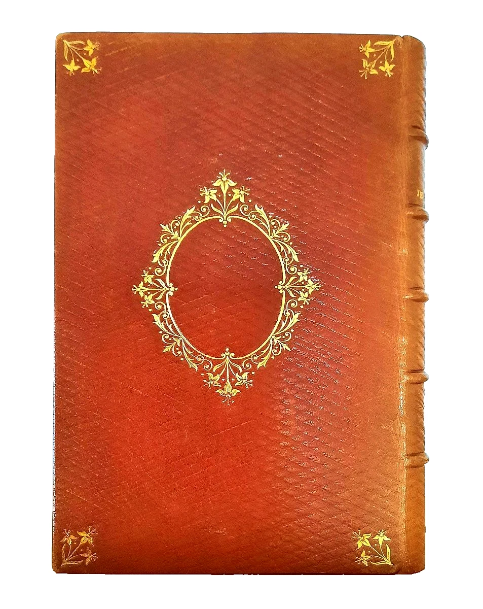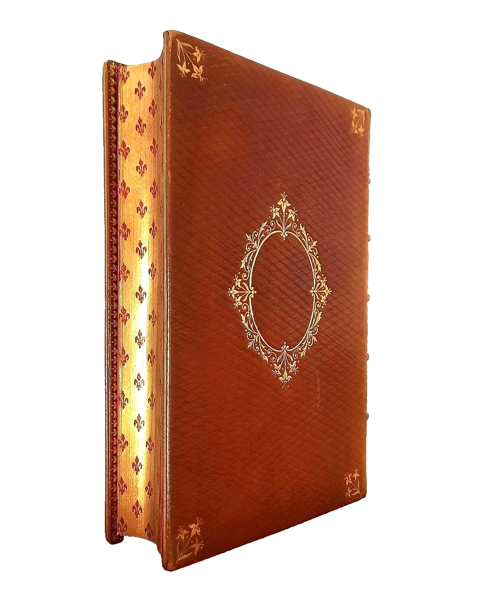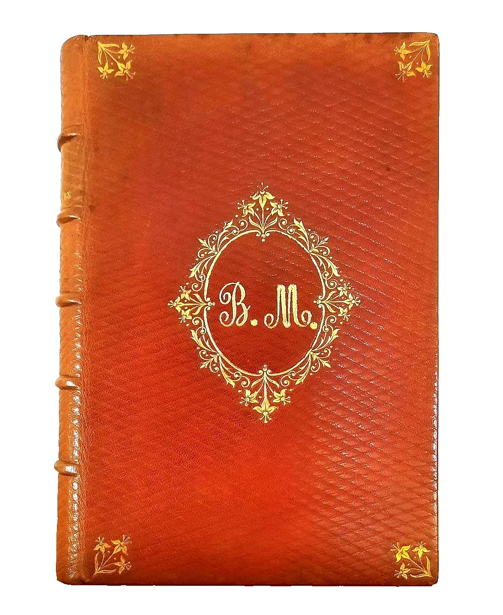"La Perfection des Jeunes Filles"; Paris, Librairie Liturgique-Catholique, 1862 (Luxury Edition by L. Lesort); Size of the book: 13,4 x 9,4 cm (5.3" x 3.7"); Brown leather binding with boards and spine embossed by ornamental decorations in gilt. Gilt initials B.M. embossed to the front board. All page edges gilt and gauffered by numerous magenta Fleur-de-Lys. Spine with five rised bands; Text in French; Collation complete - False-title, [1], Engraved frontispiece, Title page, [iv], 406 pages, with engraved plate and 2 chromolithograph plates; Full leather binding is tight and firm, overall in excellent condition with negligible shelf wear, little bumped and worn mostly to the extremities, minor discoloration. Slight tanning to the gilt page edges. Pages/Text block is bright and clear, no marks or foxing throughout, overall in immaculate condition. Overall the condition of the book is NEAR FINE.