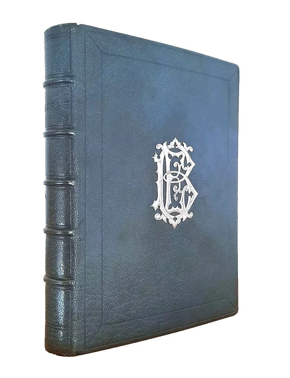 Bound in a Teal Morocco leather binding with stylized Silver Monogram Initials "BE" to the front board. Richly decorated front and rear paste-down with gilt fleurons and teal Moirée silk. Free endpapers also accompanied by teal Moirée silk.