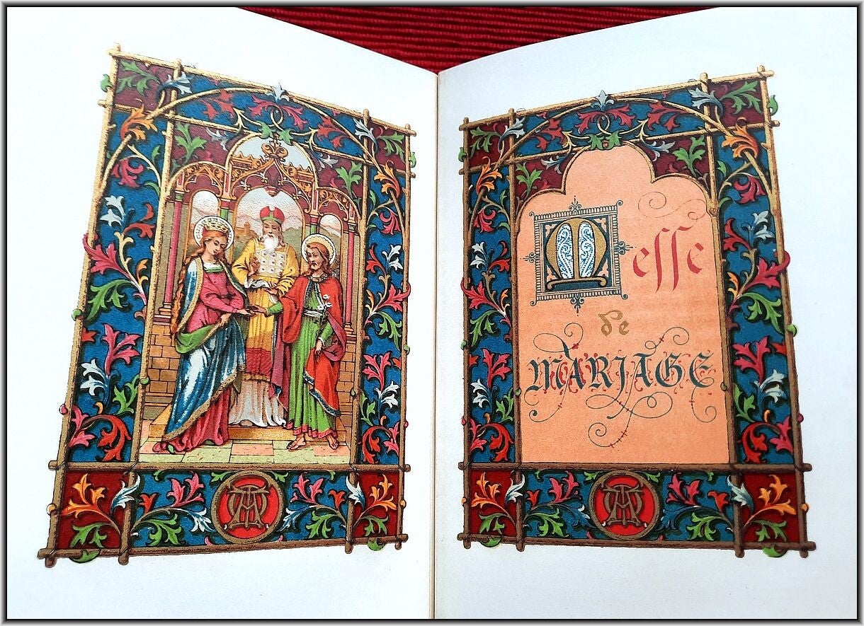We are offering here an exquisite teal Morocco leather copy of a richly illustrated and illuminated French Christian "Illustrated Hours" from circa 1860, completed by M.M. Gsell and G. Régamey. This magnificant entirely chromolithographed work containing Morning Prayers, Evening Prayers, Prayers before the Holy Mass, Prayers during the Mass, Prayers for Confession, Prayers for Communion, Vespers and Compline and Wedding Mass.
