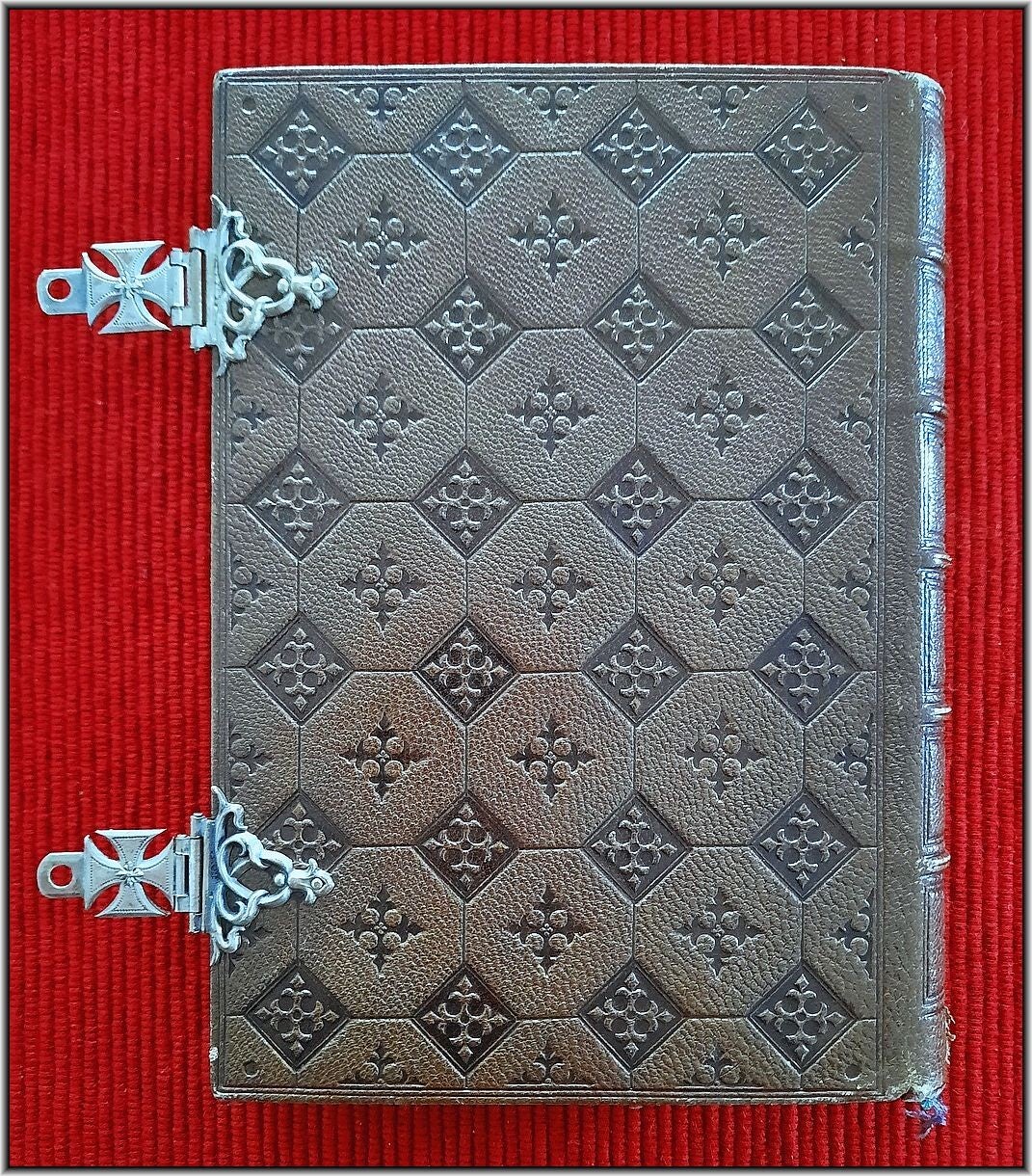 We are offering here an exquisite French Christian Catholic devotional book "Selected Book of Hours for Christian Ladies", taken from manuscripts from the 12th to the 17th Century. Bound in an unique brown Morocco leather binding with embossed boads and spine and with a two ornamental Silver Clasps with the overlapping parts in shape of Bolnisi Cross.