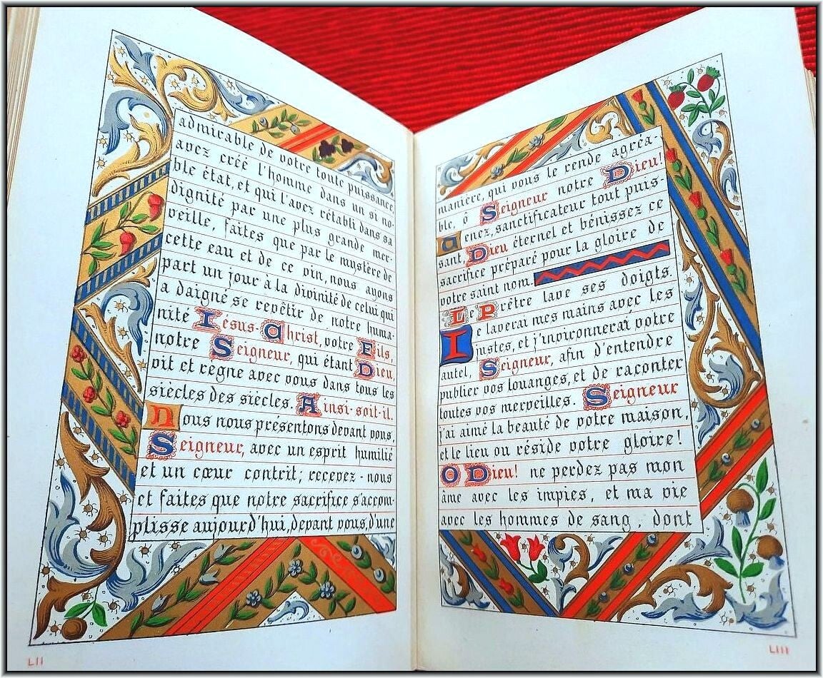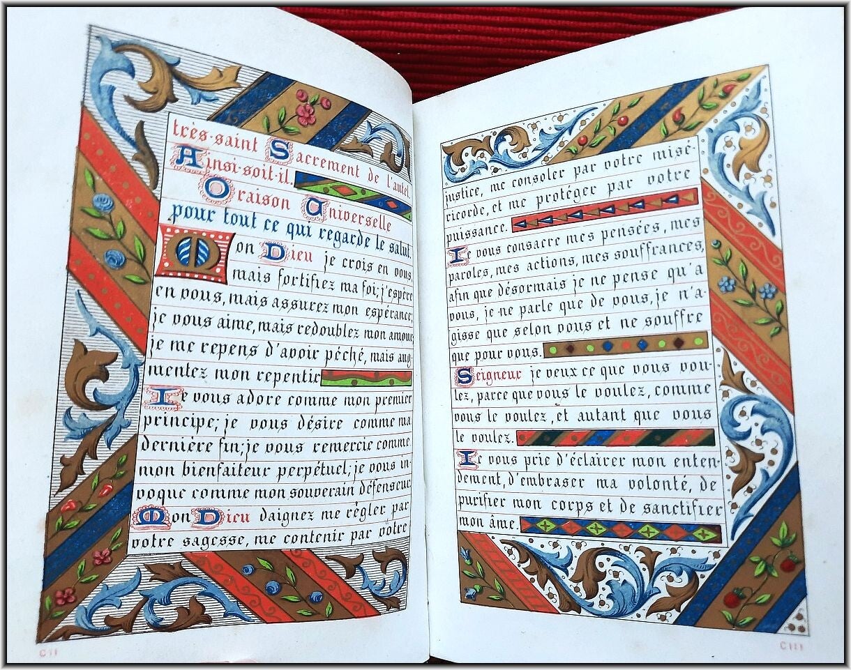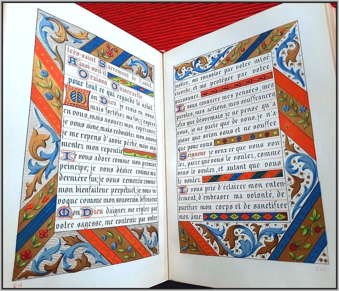 With chromolithograph frontispiece & 6 full-page chromolithograph engravings in Color & Gilt. All 208 text pages richly illustrated and illuminated by A. Leroy with a different chromolithographic frame in Color & Gilt for each page and with several chapter headers. Superb illuminations in chromolithographies inspired by medieval "Book of Hours". Letters, decorations and miniatures copied in ancient manuscripts; The text is framed with many different decorations: foliage, flowers, birds, dragons, insects, etc. All pages are printed in chromolithography on strong high quality "Japanese" paper.