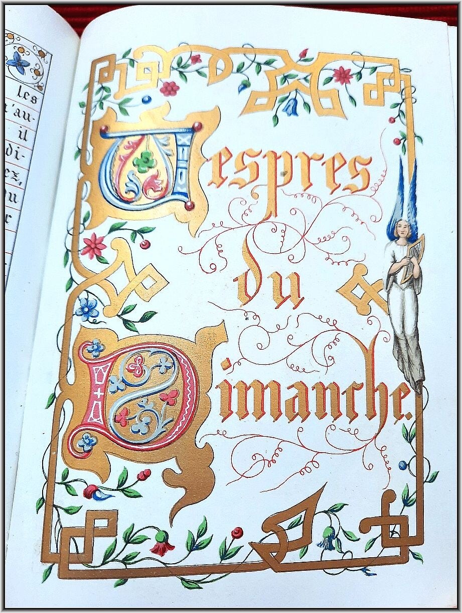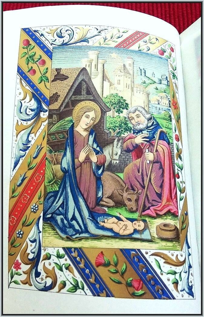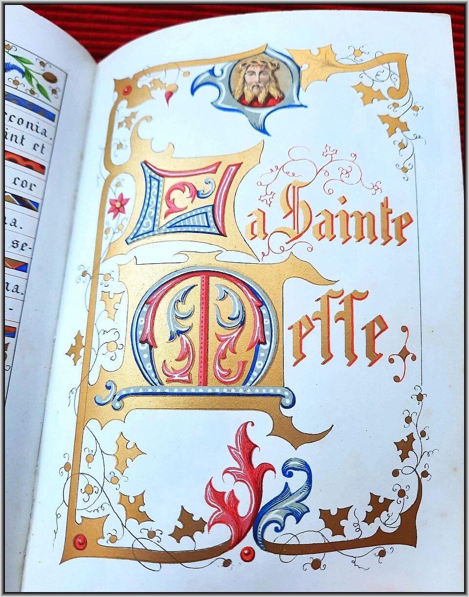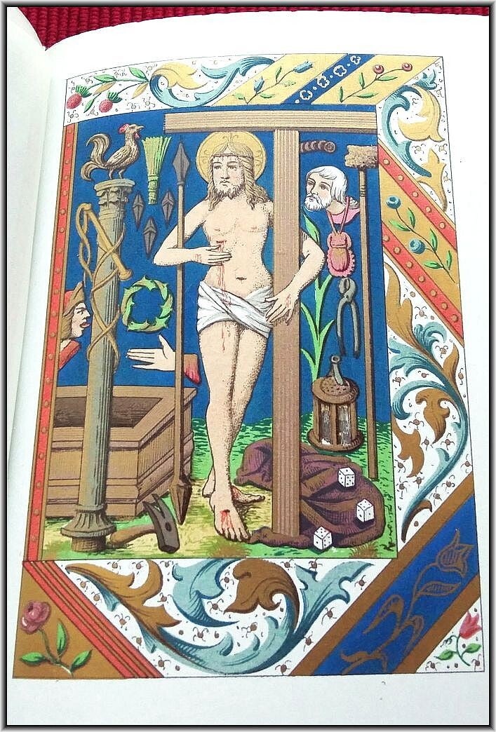 With chromolithograph frontispiece & 6 full-page chromolithograph engravings in Color & Gilt. All 208 text pages richly illustrated and illuminated by A. Leroy with a different chromolithographic frame in Color & Gilt for each page and with several chapter headers. Superb illuminations in chromolithographies inspired by medieval "Book of Hours". Letters, decorations and miniatures copied in ancient manuscripts; The text is framed with many different decorations: foliage, flowers, birds, dragons, insects, etc. All pages are printed in chromolithography on strong high quality "Japanese" paper.