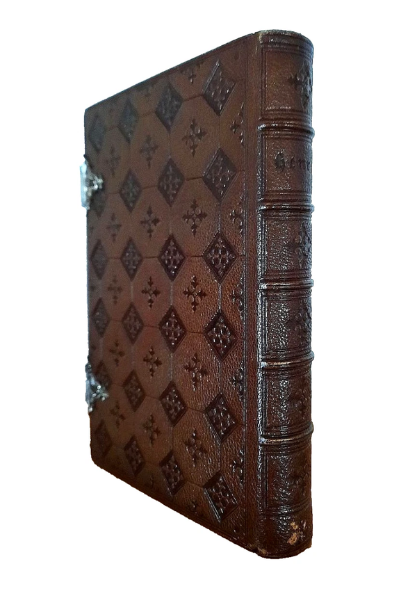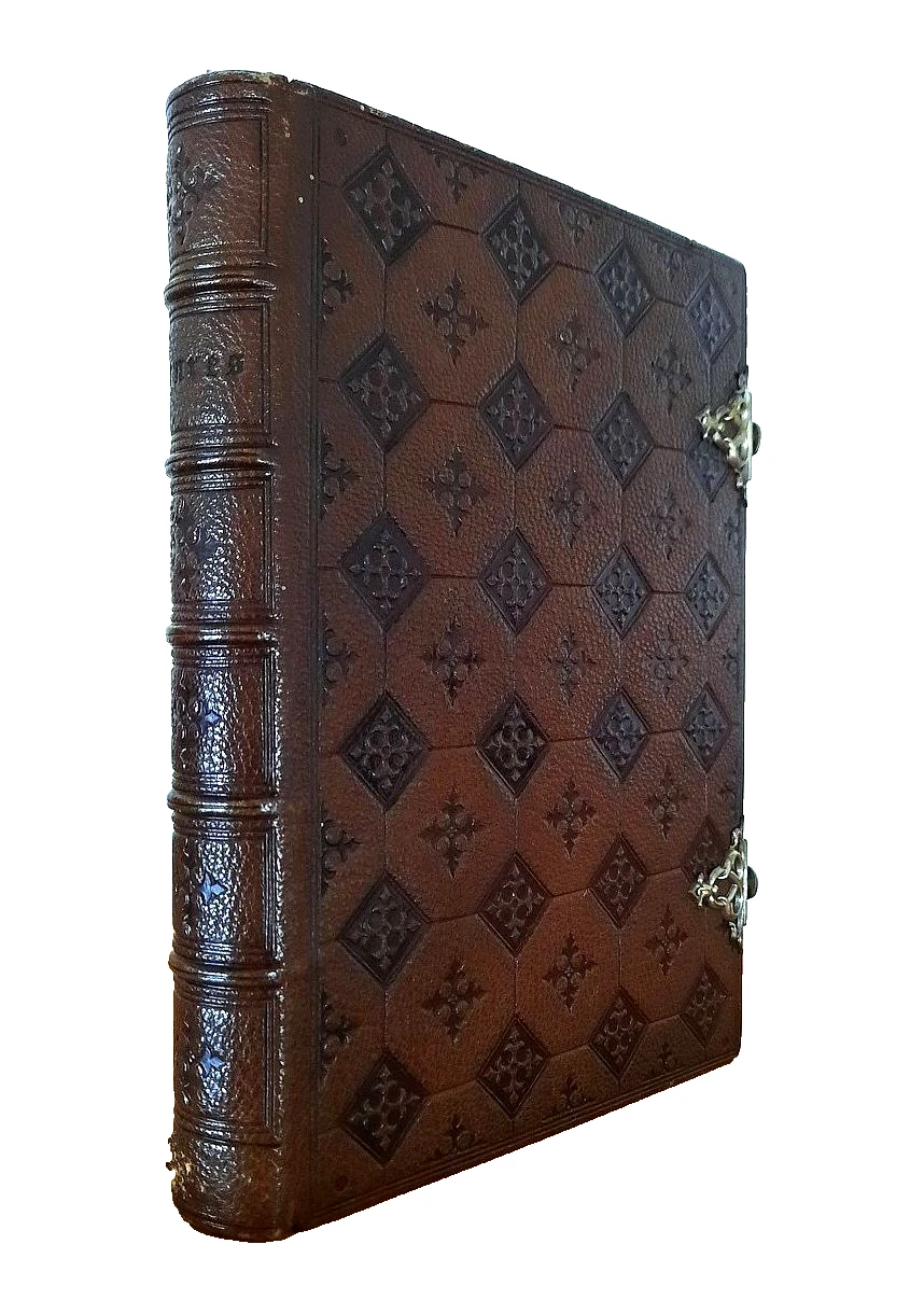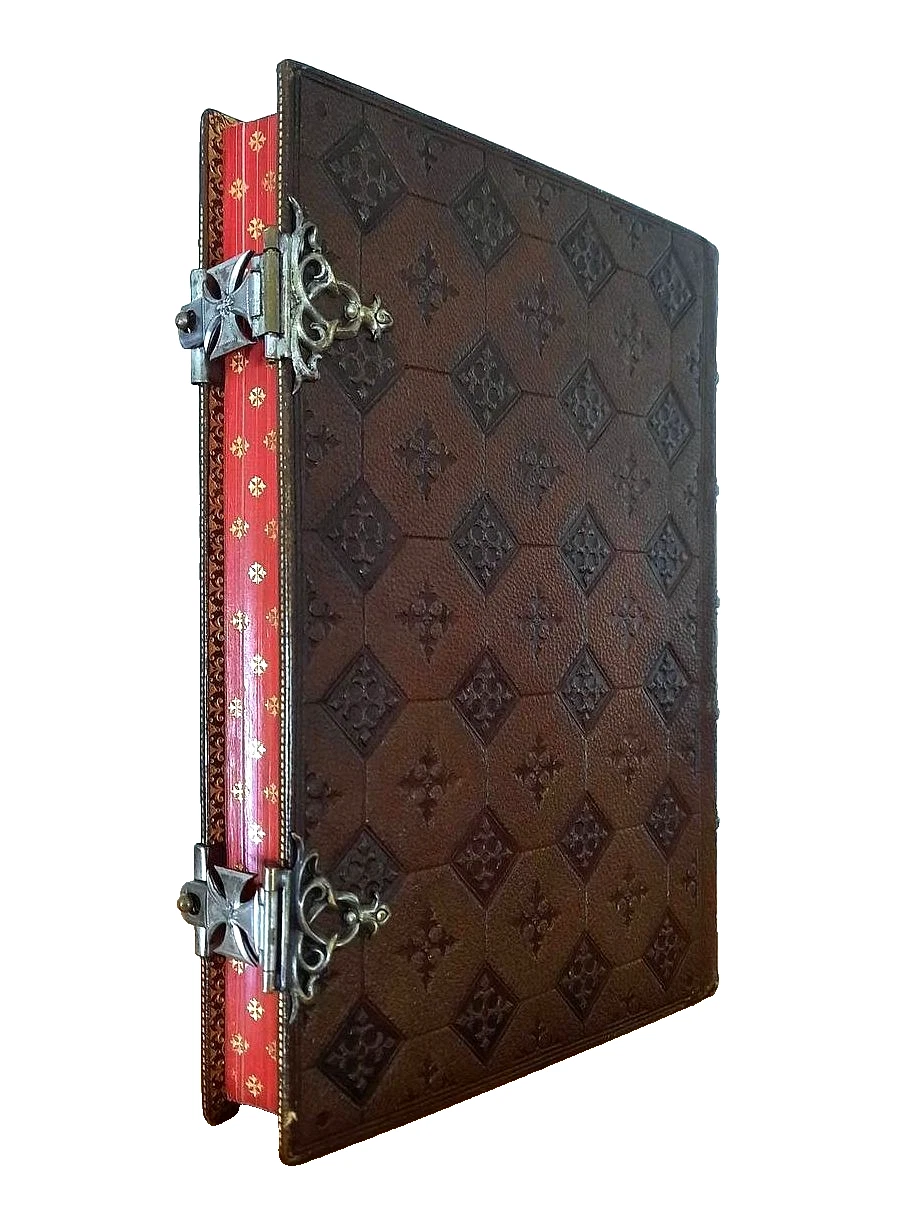 "HEURES CHOISIES des DAMES CHRETIENNES; Tire des manuscrits du XIIe au XVIIe siecle provenant du cabinet de Mr. H. Baudot, à Dijon"; Paris, L. Lesort, 1860; Size of the book: 15,8 x 11,5 cm (6.22" x 4.52"); Embossed brown Morocco leather binding with two silver clasps. Spine with five rised bands. All page edges red and gauffered in gilt by ornamental crosses; Text in French; Collation complete - Chromolithograph title page, Engraved chromolithograph title, Chromolithograph frontispiece, 208 chromolithograph pages, with 6 chromolithograph plates; Full leather binding is strong, tight and firm, overall in excellent condition, with minor shelf wear. Small surface scratching to the bottom of the spine and a few minor surface scuffings to the extremities. Pages/Text block in excellent condition, clean and very bright, no any marks or annotations, a few pages with minor and light foxing dots to the white margins, slight yellowing to the white margins. Overall the condition of the book is NEAR FINE.