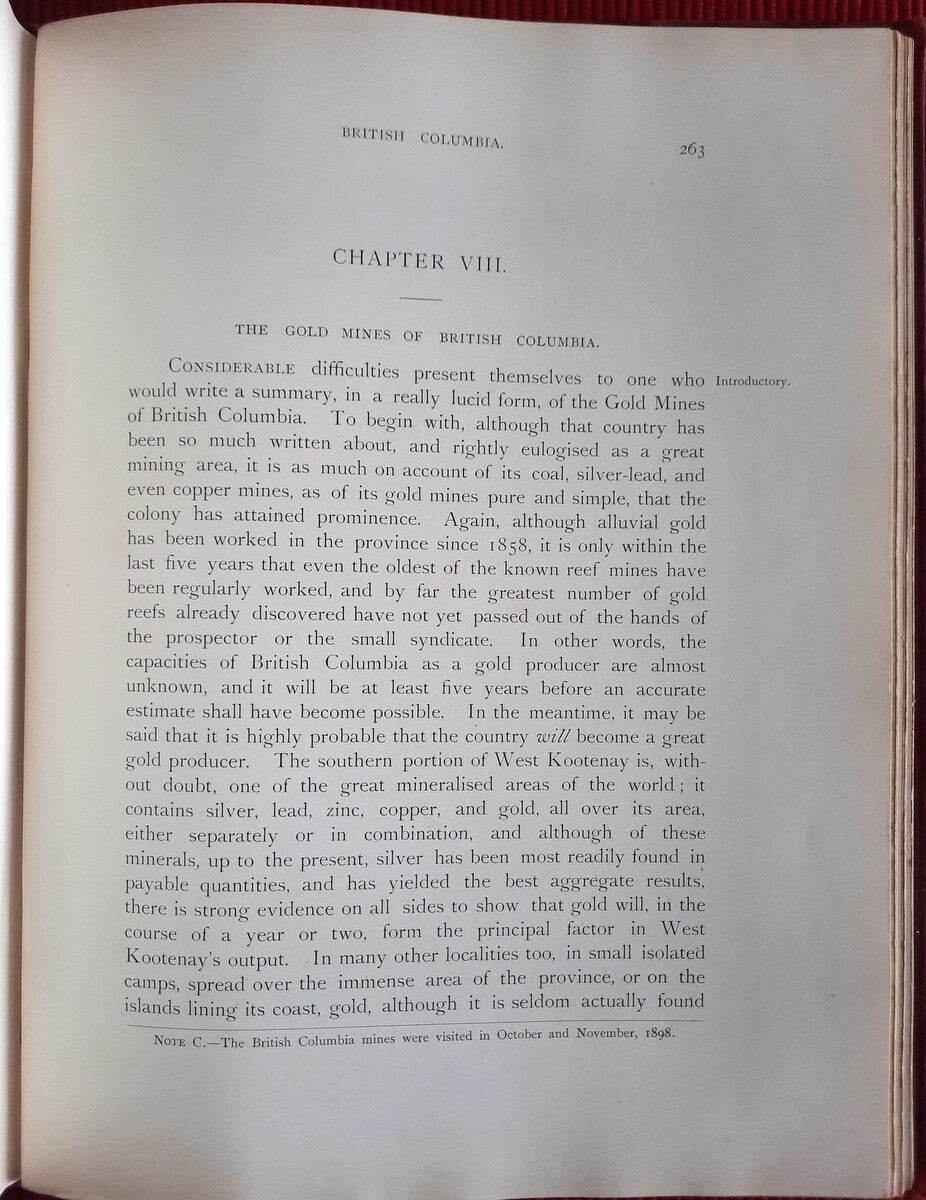 Scarce first edition of this comprehensive mining work contains a concise and practical advice for investors gathered from a personal inspection of the mines of Transvaal, Rhodesia, India, West Australia, Queensland, New Zealand and British Columbia. With 35 photographic b&w plates (including the large multiple folding frontispiece - 74 x 24,5 cm), plus 27 tables and 7 plans. Much about the Gold Mines of the Transvaal and the Gold Mines of Rhodesia.