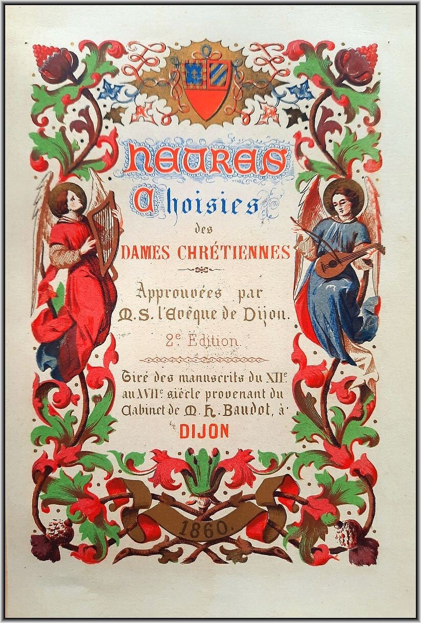 "HEURES CHOISIES des DAMES CHRETIENNES; Tire des manuscrits du XIIe au XVIIe siecle provenant du cabinet de Mr. H. Baudot, à Dijon"; Paris, L. Lesort, 1860; Size of the book: 15,8 x 12 cm (6.22" x 4.72"); Brown Morocco leather binding. Gilt Coat of Arm Christogram to both boards. Gilt ornamental decorations to the boards and spine, gilt title to the spine. Spine with five rised bands. All page edges gilt; Text in French; Collation complete - Chromolithograph title page, Engraved chromolithograph title, Chromolithograph frontispiece, 208 chromolithograph pages, with 5 chromolithograph plates; Full leather binding is strong, tight and firm, overall in very good condition. Boards and spine little rubbed and bumped, with a few negligible surface scratches/scuffings. Short incipient surface cracking (1,5 - 2 cm) to the lower joint of the front board and upper joint of the rear board. Pages/Text block in excellent condition, clean and very bright, no any marks or foxing throughout, only with a slight yellowing to the white margins of a few pages. Overall the condition of the book is NEAR FINE.
