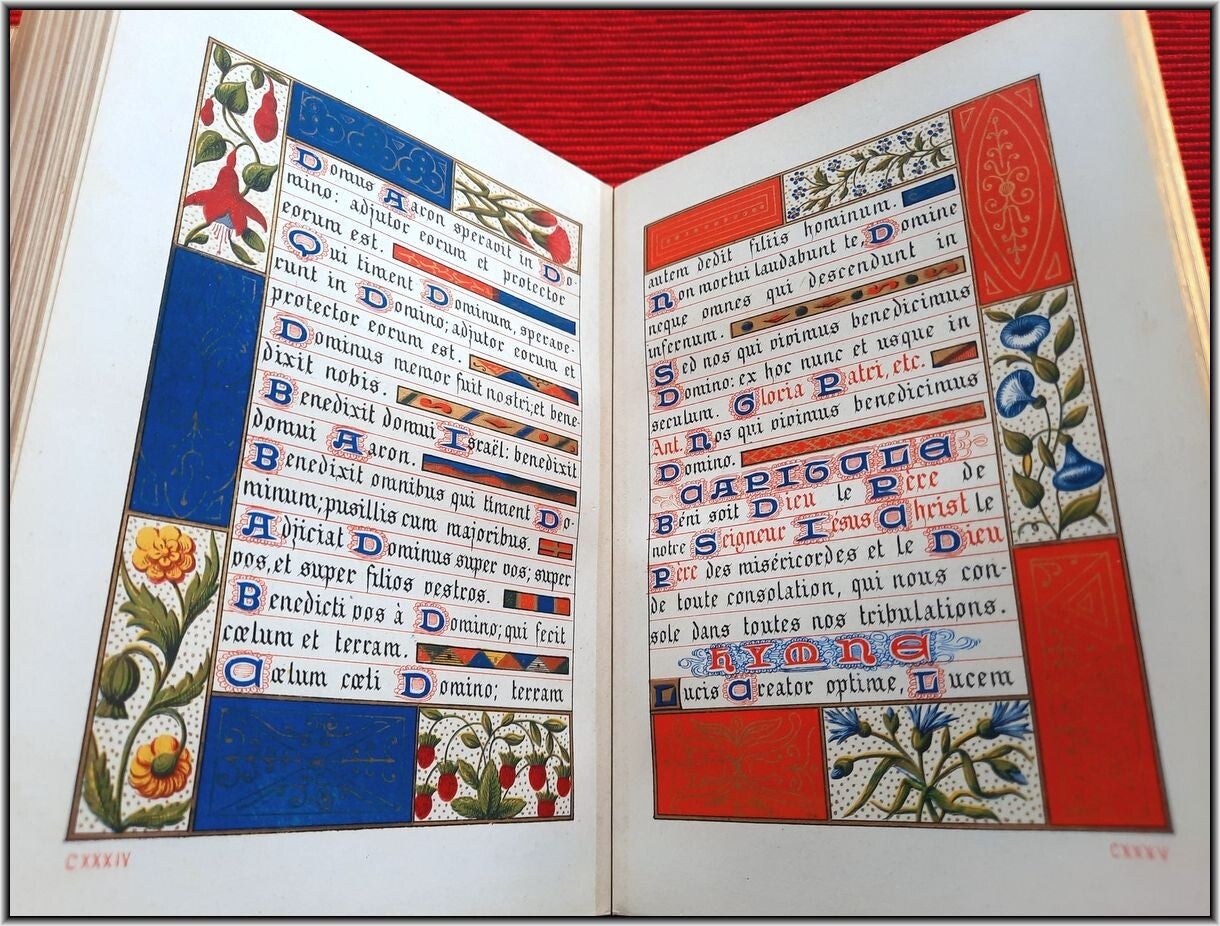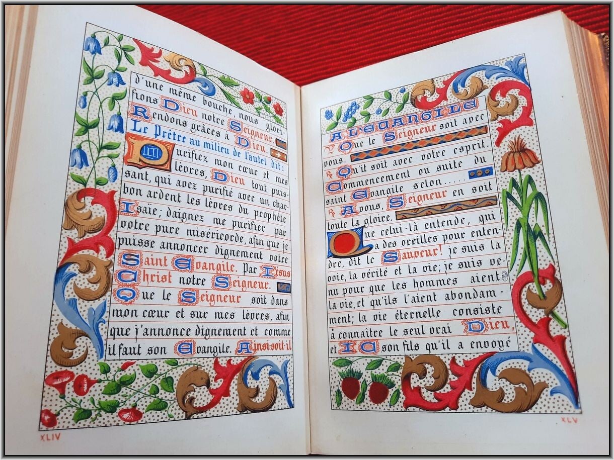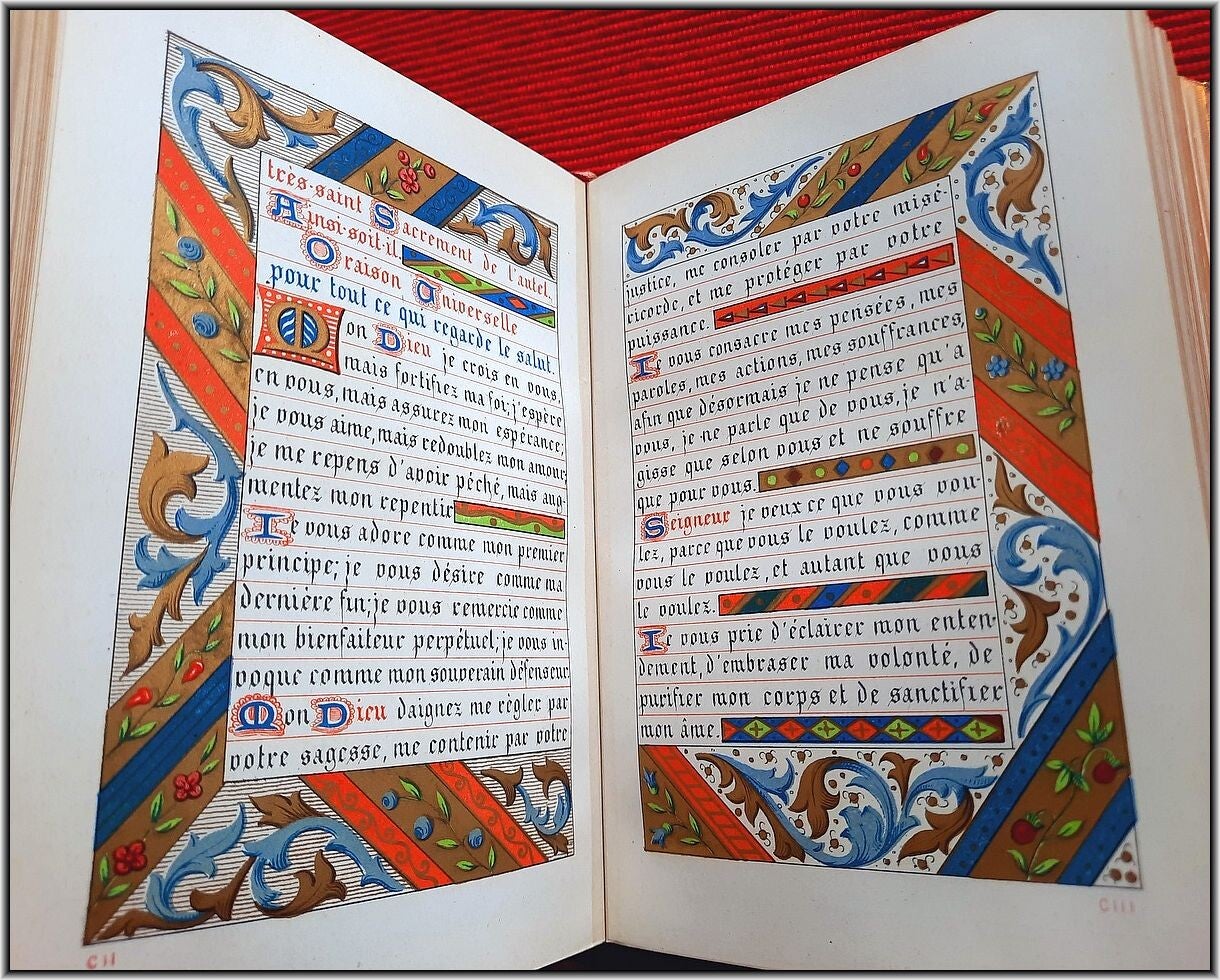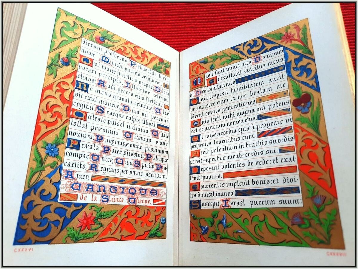 With chromolithograph frontispiece & 5 full-page chromolithograph engravings in Color & Gilt. All 208 text pages richly illustrated and illuminated by A. Leroy with a different chromolithographic frame in Color & Gilt for each page and with several chapter headers. Superb illuminations in chromolithographies inspired by medieval "Book of Hours". Letters, decorations and miniatures copied in ancient manuscripts; The text is framed with many different decorations: foliage, flowers, birds, dragons, insects, etc. All pages are printed in chromolithography on strong high quality "Japanese" paper.