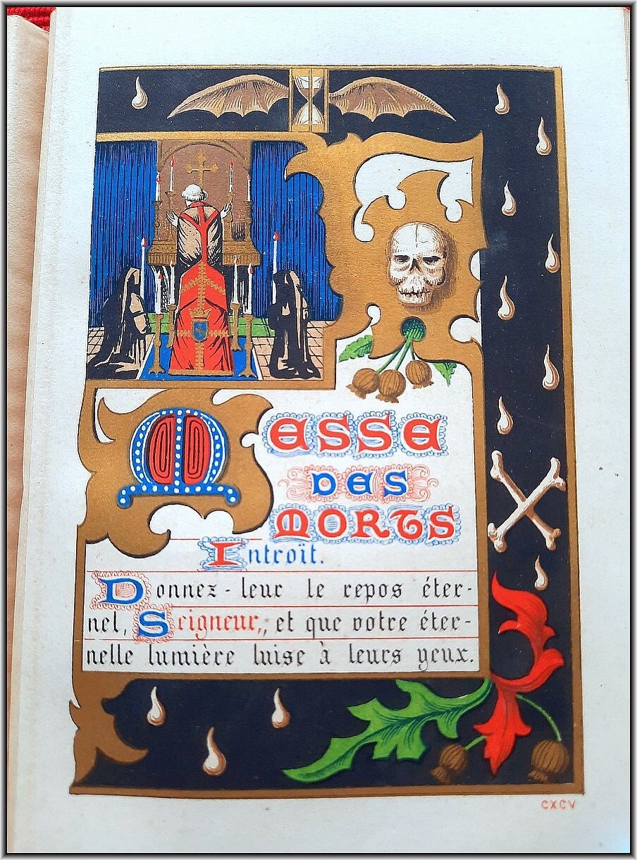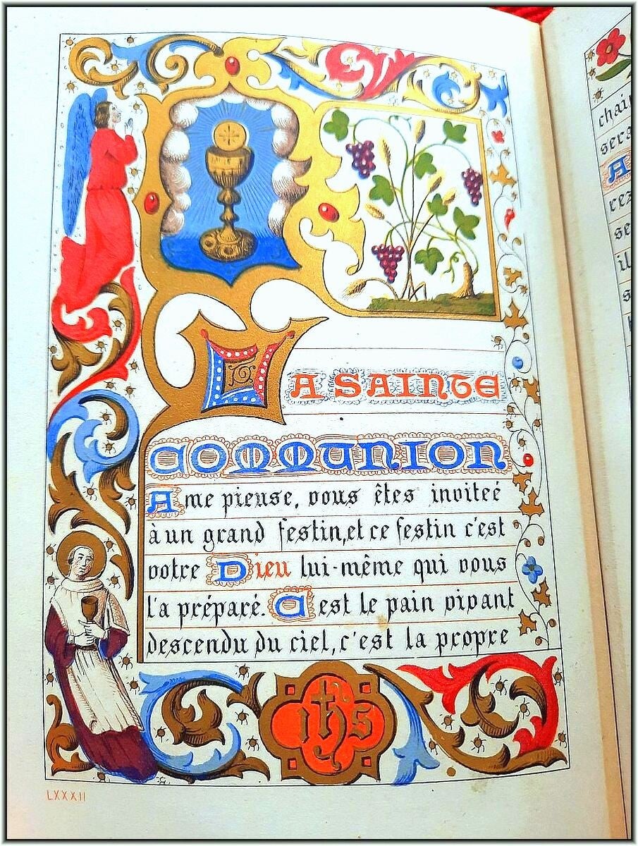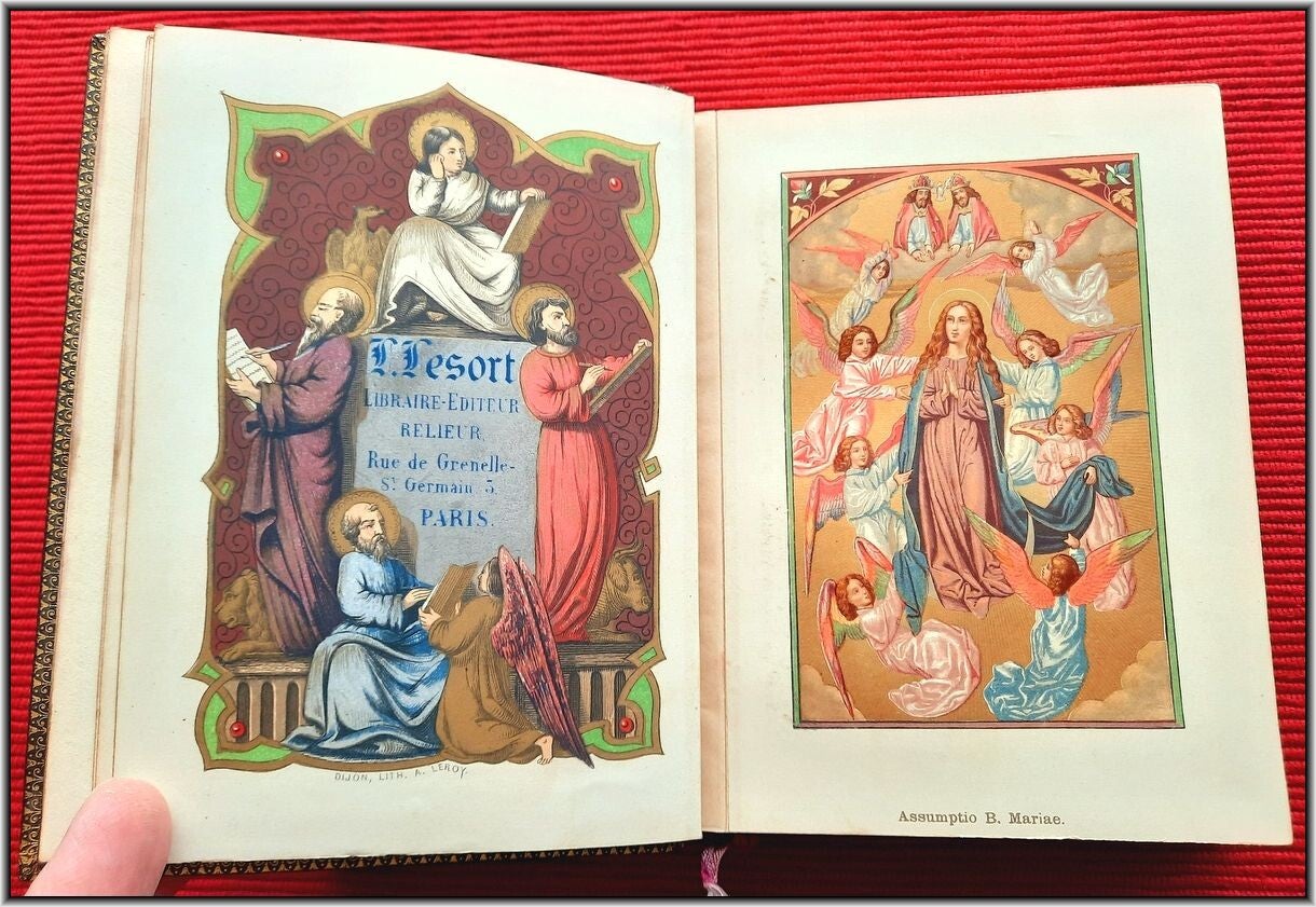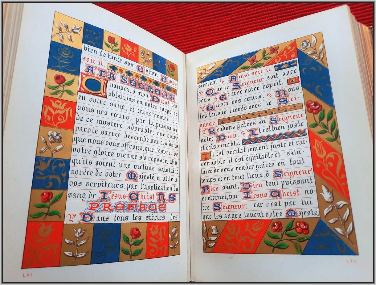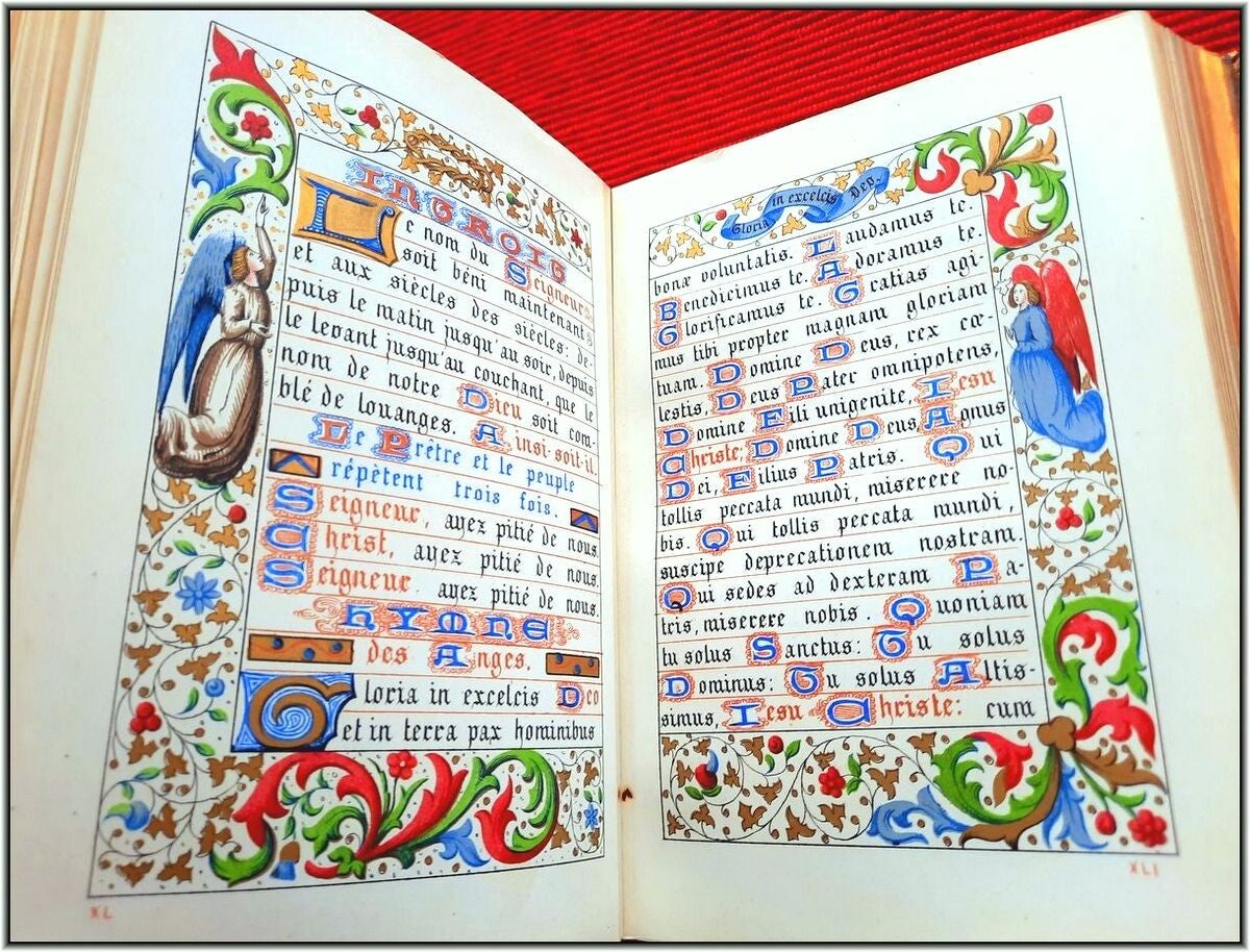 With chromolithograph frontispiece & 5 full-page chromolithograph engravings in Color & Gilt. All 208 text pages richly illustrated and illuminated by A. Leroy with a different chromolithographic frame in Color & Gilt for each page and with several chapter headers. Superb illuminations in chromolithographies inspired by medieval "Book of Hours". Letters, decorations and miniatures copied in ancient manuscripts; The text is framed with many different decorations: foliage, flowers, birds, dragons, insects, etc. All pages are printed in chromolithography on strong high quality "Japanese" paper.