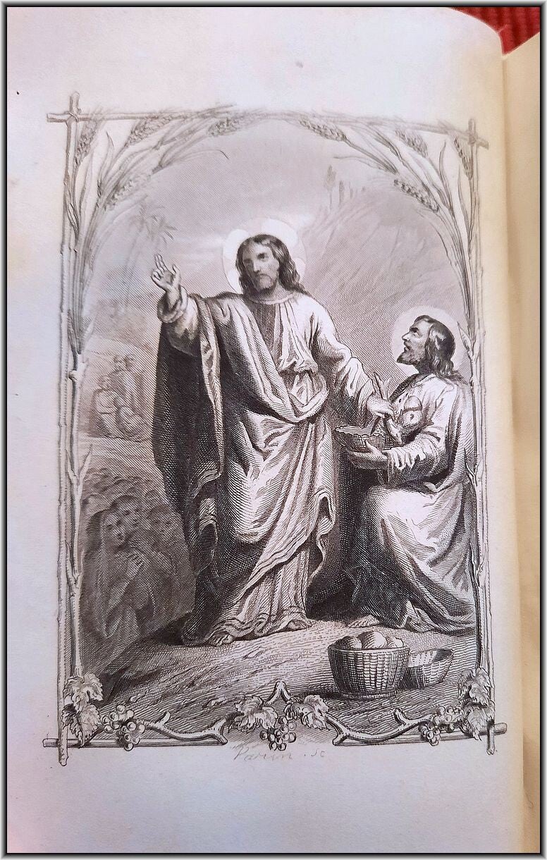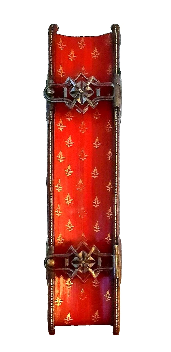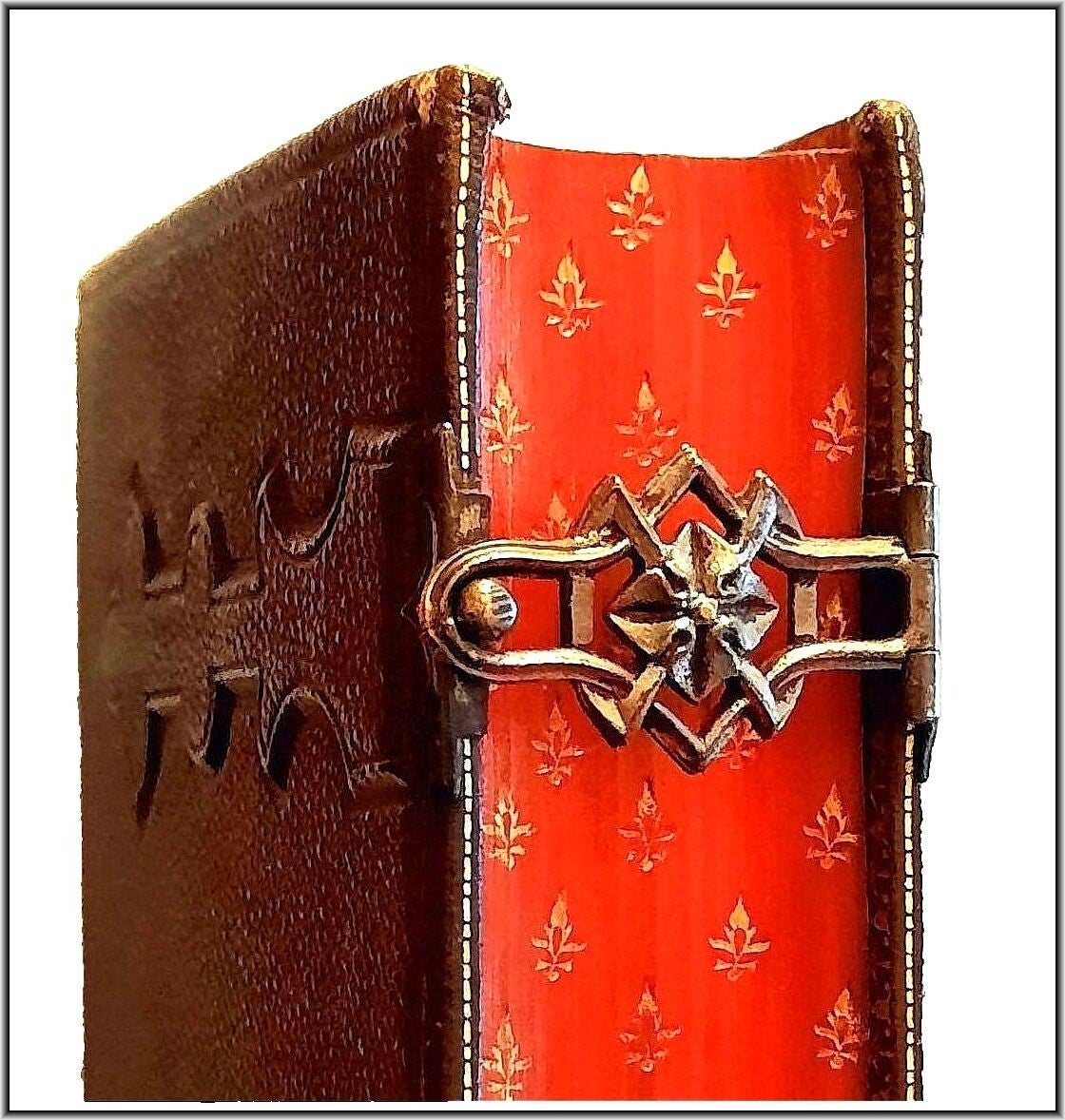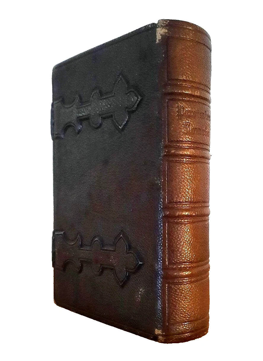 We are offering here an uniquely clasped fine binding copy of French Christian Catholic devotional book "Roman Parishioner" from 1859. Brown leather binding with two ornamental Metal Clasps. All page edges Red & Gauffered in gilt. With chromolithograph title page, engraved frontispiece and 3 engraved plates illustrated by Biblical motives.