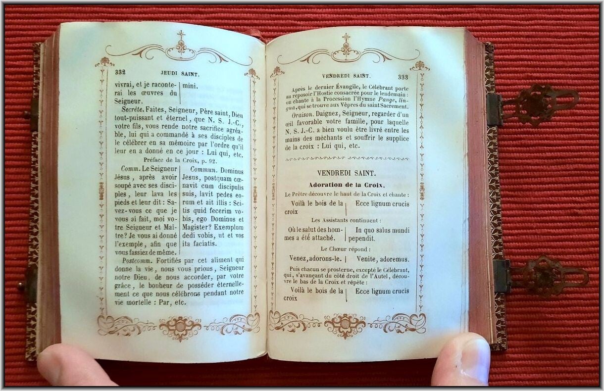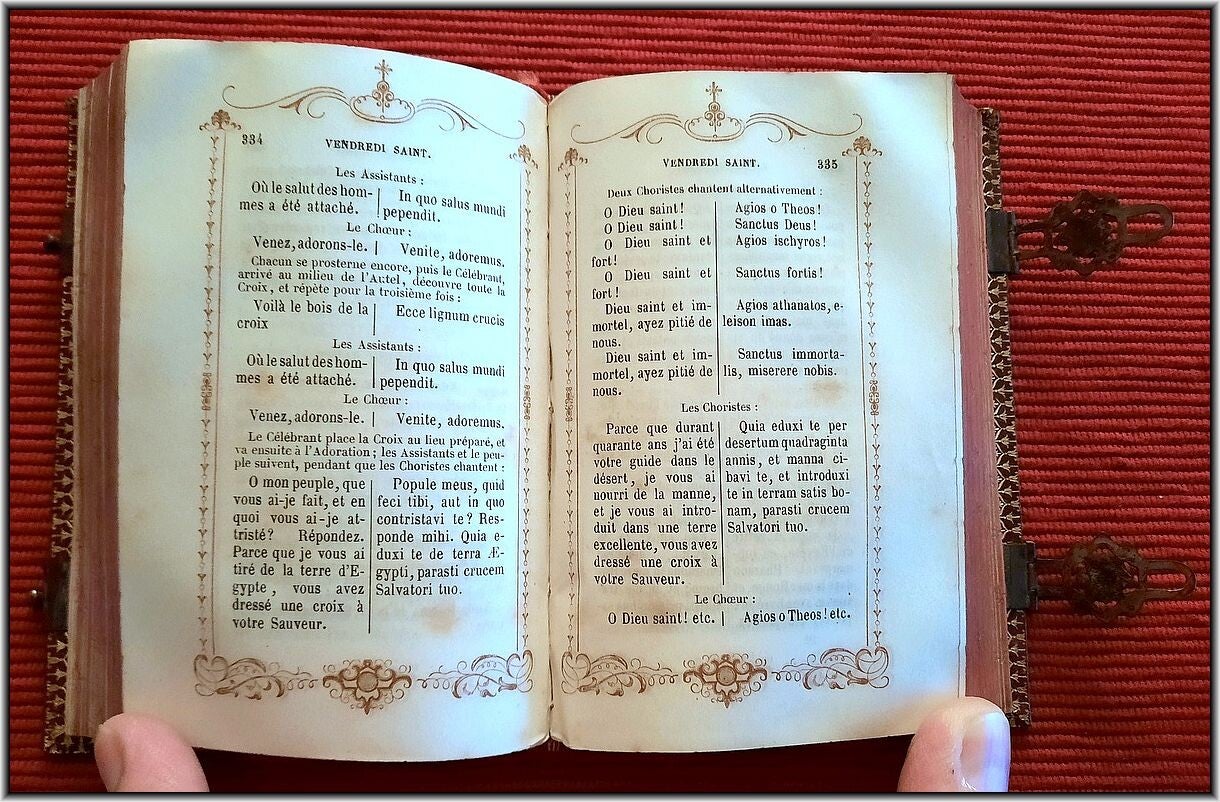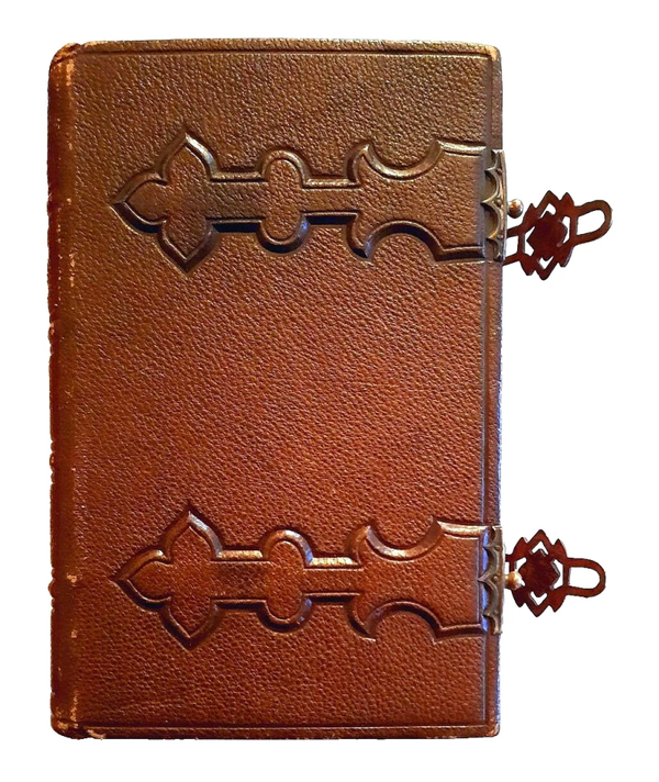 "PAROISSIEN ROMAIN"; Dijon, Antoine Maitre, 1859; Size of the book: 13 x 8,7 cm (5.1" x 3.4"); Brown leather binding with a two ornamental metal clasps. Boards with debossed ornamental adorations. Spine with four raised bands. All page edges red and gauffered in gilt; Text in French; Collation complete - False title, [1], Frontispiece, Chromolithograph title page, Title page, 734 pages, with 3 b&w engraved plates; Full leather binding is tight and firm, overall in very good condition, with minor rubbing and surface scuffings to the extremities, minor discoloration, corners bumped. Metal clasps fully functional and well preserved, strong and fully functional, with some patina. Pages/Text block in very good condition, very bright and clear, no marks throughout, occasional light foxing mostly to white margins, minor tanning/yellowing. Overall the condition of the book is VERY GOOD.