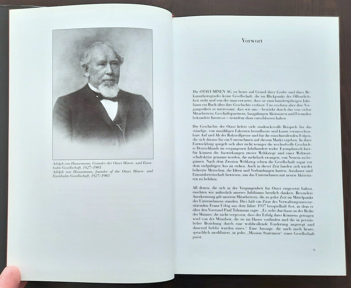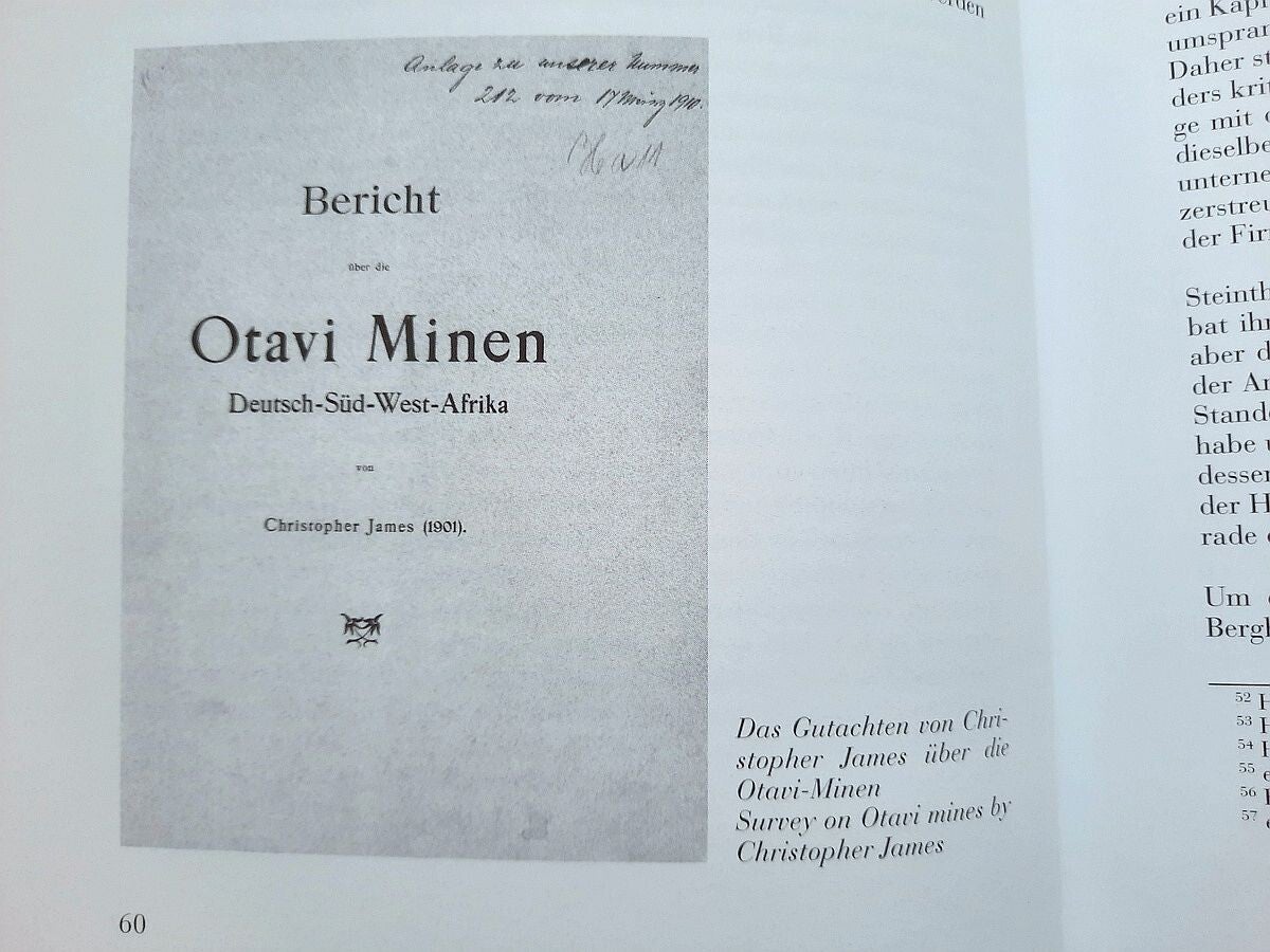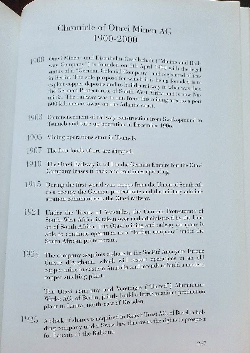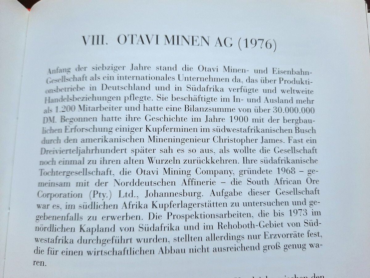 The book also includes the complete "Chronicle of Otavi Mines Ltd. (1900-2000)" both in german and english language; and the complete lists of Management and Board of Directors of the Otavi Mining and Railway Company (1900-1976), and Board of Directors and Supervisory Board of Otavi Minen AG (1976-2000).