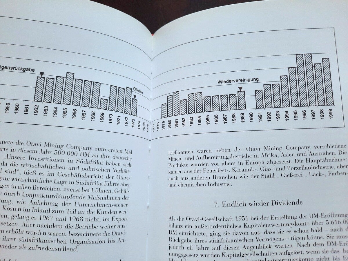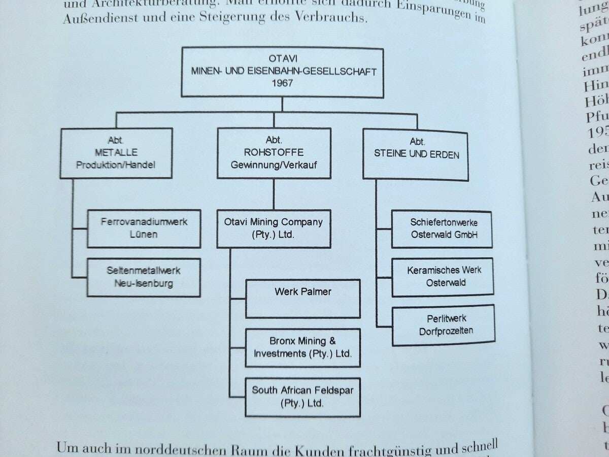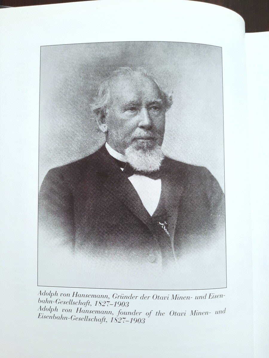 The book also includes the complete "Chronicle of Otavi Mines Ltd. (1900-2000)" both in german and english language; and the complete lists of Management and Board of Directors of the Otavi Mining and Railway Company (1900-1976), and Board of Directors and Supervisory Board of Otavi Minen AG (1976-2000).