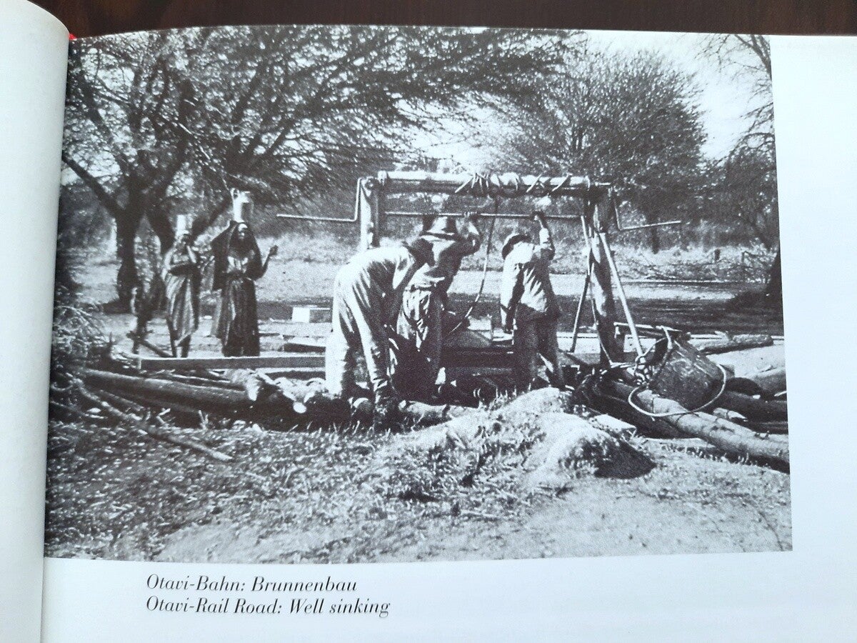 This scarce book printed in a small limited edition was based on an unpublished manuscript by Wilhelm Treue, "History of the Otavi Mining and Railway Company 1900-1975". With numerous photographic illustrations and maps; including the double-page coloured map "German South West Africa. Map of the Swakopmund-Tsumeb Railway, including the Swakopmund-Windhuk Government Railway" with inserted the "Map of the land area of the South West Africa Company, Ltd.", showing the land and mining rights of the Otavi Mining and Railway Company, and the "Map of the Tsumeb Mine".