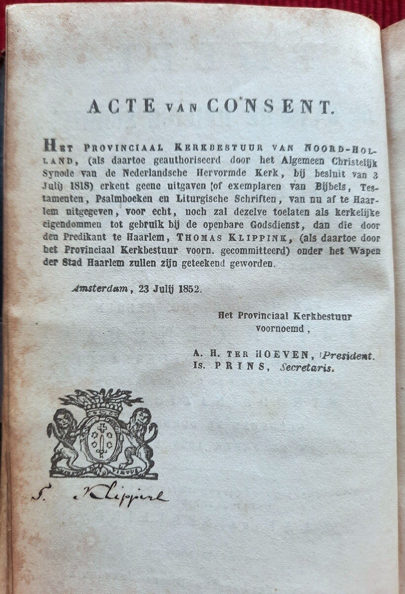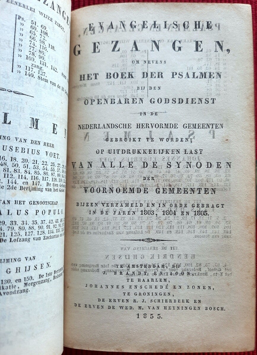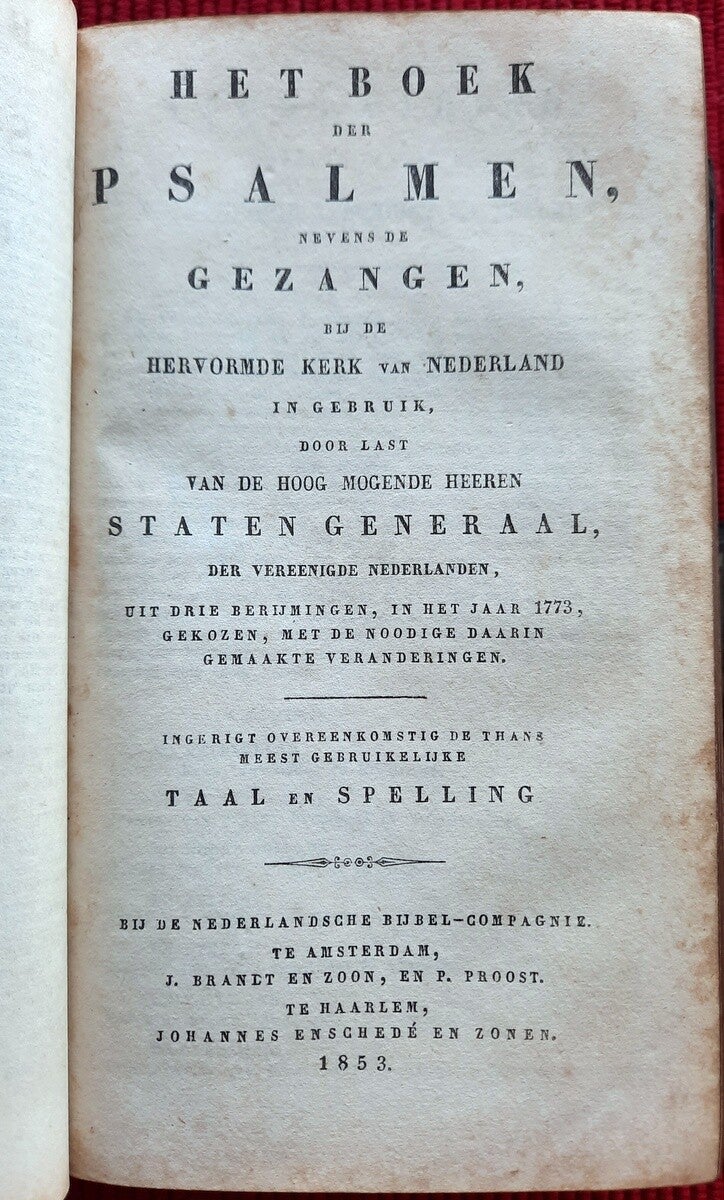 Original Dutch Bible from 1853 with the entire Holy Scripture, containing all the canonical books of the Old and New Testaments faithfully translated from the original languages into Dutch language. In accordance with the decision of the National Synod held in Dordrecht in 1618 and 1619. Bound together with separately published "The New Testament", "The Book of Psalms", "Evangelical Songs" and "Catechism, or Instruction in Christian Doctrine" ("Het Nieuwe Testament" (1853); "Het Boek der Psalmen" (1853); "Evangelische Gezangen" (1855); "Catechismus, of Onderwijzing in de Christelijke Leer, die...").