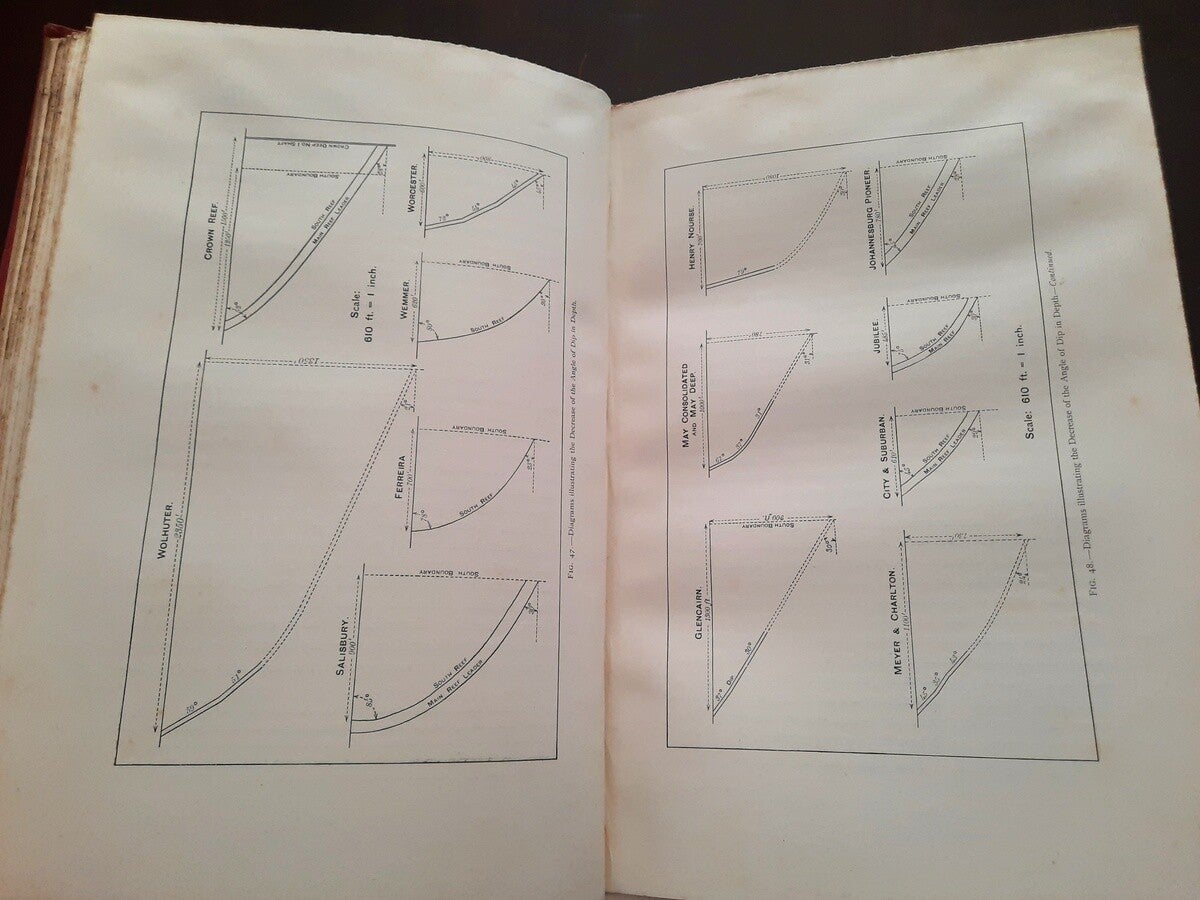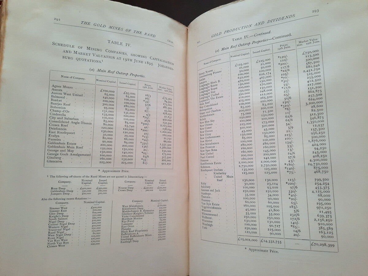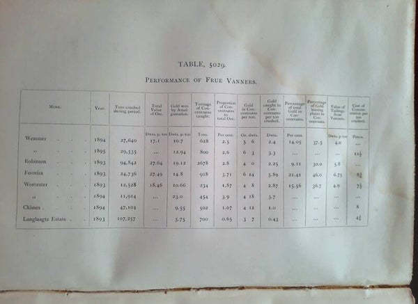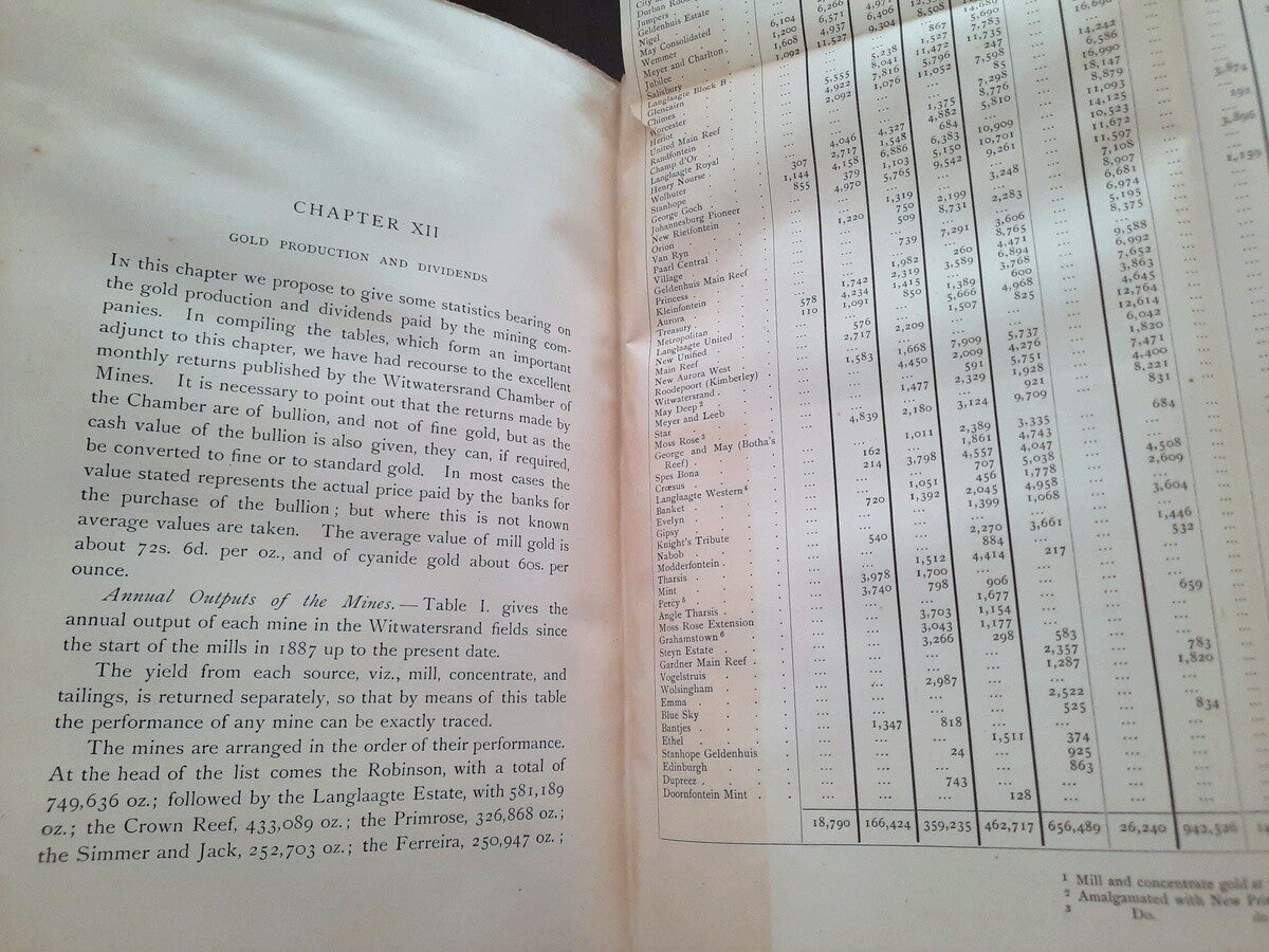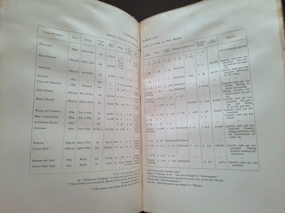 A scarce book with 5 colored multiple folding plans & sections, 14 photo plates, folding table with "Annual output of the mines in the Witwatersrand Goldfields from 1887 to June, 1895", "Table of monthly outputs of the Witwatersrand mines from 1887 to June, 1895", folding table with "Summary of dividends paid by Witwatersrand gold mining companies from 1887 to June, 1895", table with "Schedule of Mining Companies showing Capitalisation and Market Valuation at 19th June, 1895. Johannesburg quotations". Including the chapters "Gold law and mining regulations" and "Gold production and dividends". Also contains 80 in-text figures, and many other tables, statistics, calculations, etc.