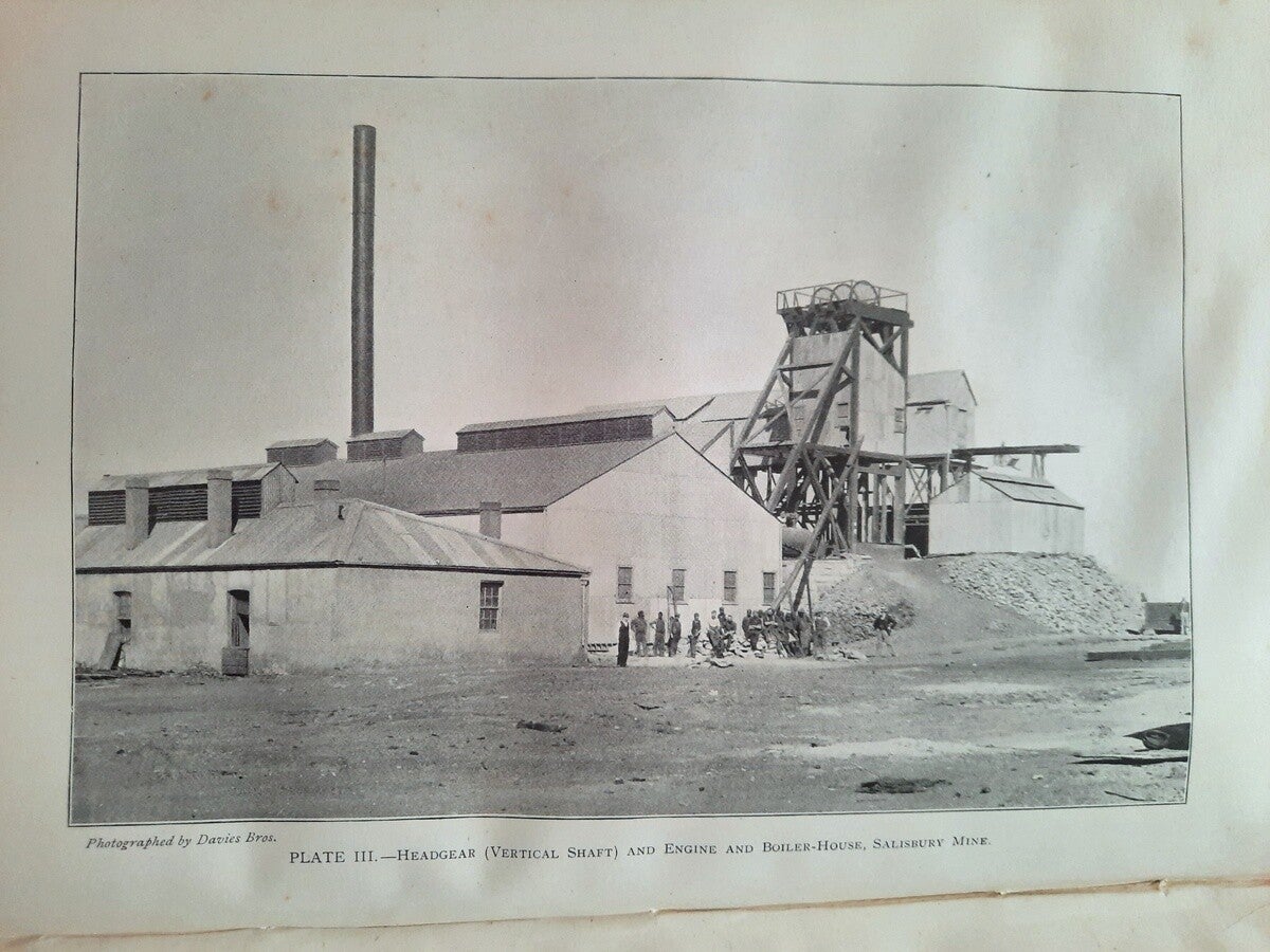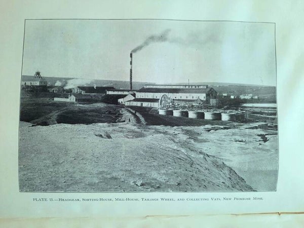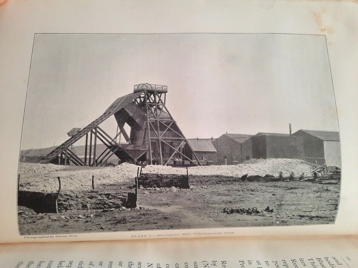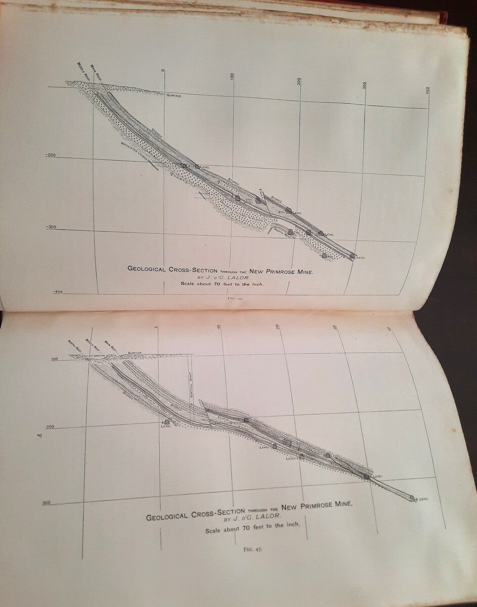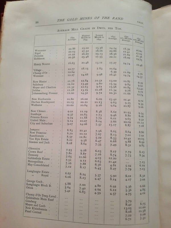 A scarce book with 5 colored multiple folding plans & sections, 14 photo plates, folding table with "Annual output of the mines in the Witwatersrand Goldfields from 1887 to June, 1895", "Table of monthly outputs of the Witwatersrand mines from 1887 to June, 1895", folding table with "Summary of dividends paid by Witwatersrand gold mining companies from 1887 to June, 1895", table with "Schedule of Mining Companies showing Capitalisation and Market Valuation at 19th June, 1895. Johannesburg quotations". Including the chapters "Gold law and mining regulations" and "Gold production and dividends". Also contains 80 in-text figures, and many other tables, statistics, calculations, etc.