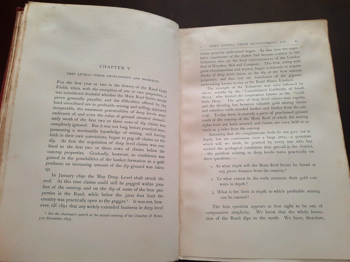"The Gold Mines of the Rand. Being a description of the mining industry of Witwatersrand South African Republic. With maps, plans and illustrations."; London and New York, Macmillan and Co., 1895; First edition; 26 x 17,5 cm; Original red cloth hardcovers; Text in English; Collation complete - False title, Title page, xvii, 306 pages, with 80 in-text figures, 14 photo plates, and 5 colored multiple folding plans and sections (the list of contents calls for two maps at rear, but they been printed only for a first impression of the first edition of this title - this is a second impression of the first edition without two mentioned maps); Binding is tight and firm, slightly rubbed, discoloured and dusty, corners and spine extremities bumped, short surface cloth tear to the upper front joint (2 cm). Otherwise the binding is strong and whole, no outer or inner crackings. The text block/pages and all plates are very bright and clean with little yellowing, a few pages with pencil annotations to the white margins. Some pages have water stains at the top corner, a few pages with a few very light foxing dots. A good copy.