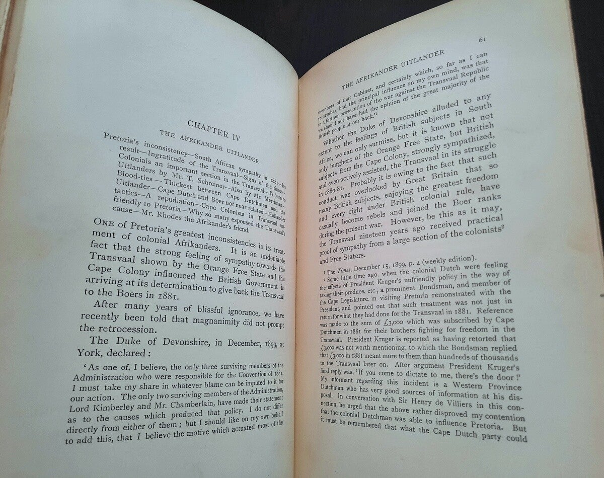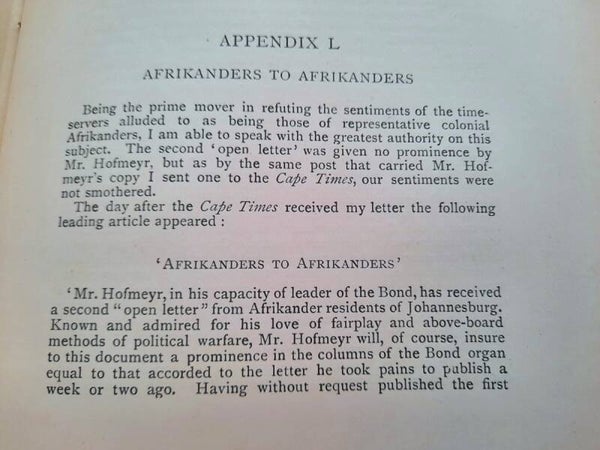 This book was written to help those not conversant with South African conditions and affairs to better understand the general position of the country. It includes chapters on Paul Kruger and his trial, the Bond and its aims, the Afrikander Uitlander, the culpability of the Bond Cabinet, and Boer apologists.
