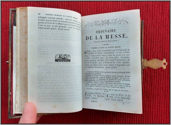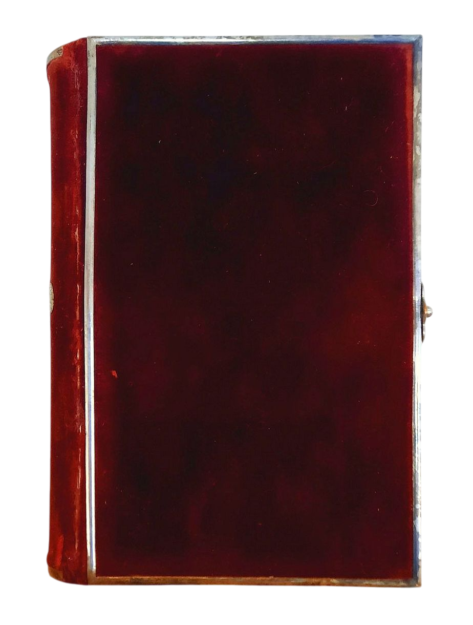 "Nouveau Paroissien Romain"; Tours, Alfred Mame et Cie, 1851; Size of the book: 12,7 x 9 cm (5" x 3.5"); Red velvet binding with silver framed boards and spine and silver clasp. Silver plate with engraved title to the spine. All page edges gilt; Text in Latin and French; Collation complete - False title, [1], Frontispiece, Chromolithograph title page, Title page, 796 pages, with 3 b&w engraved plates; Full red velvet binding is tight and firm, overall well preserved with minor shelf wears. Insignificant rubbing, silver frames, clasp and title with some patina. Front joint with incipient surface wear from use (from opening the front board). Pages/Text block in very good condition, very clean and bright, no marks throughout, with occasional foxing mostly to the title page, engravings and tissue guards. Overall the condition of the book is VERY GOOD.