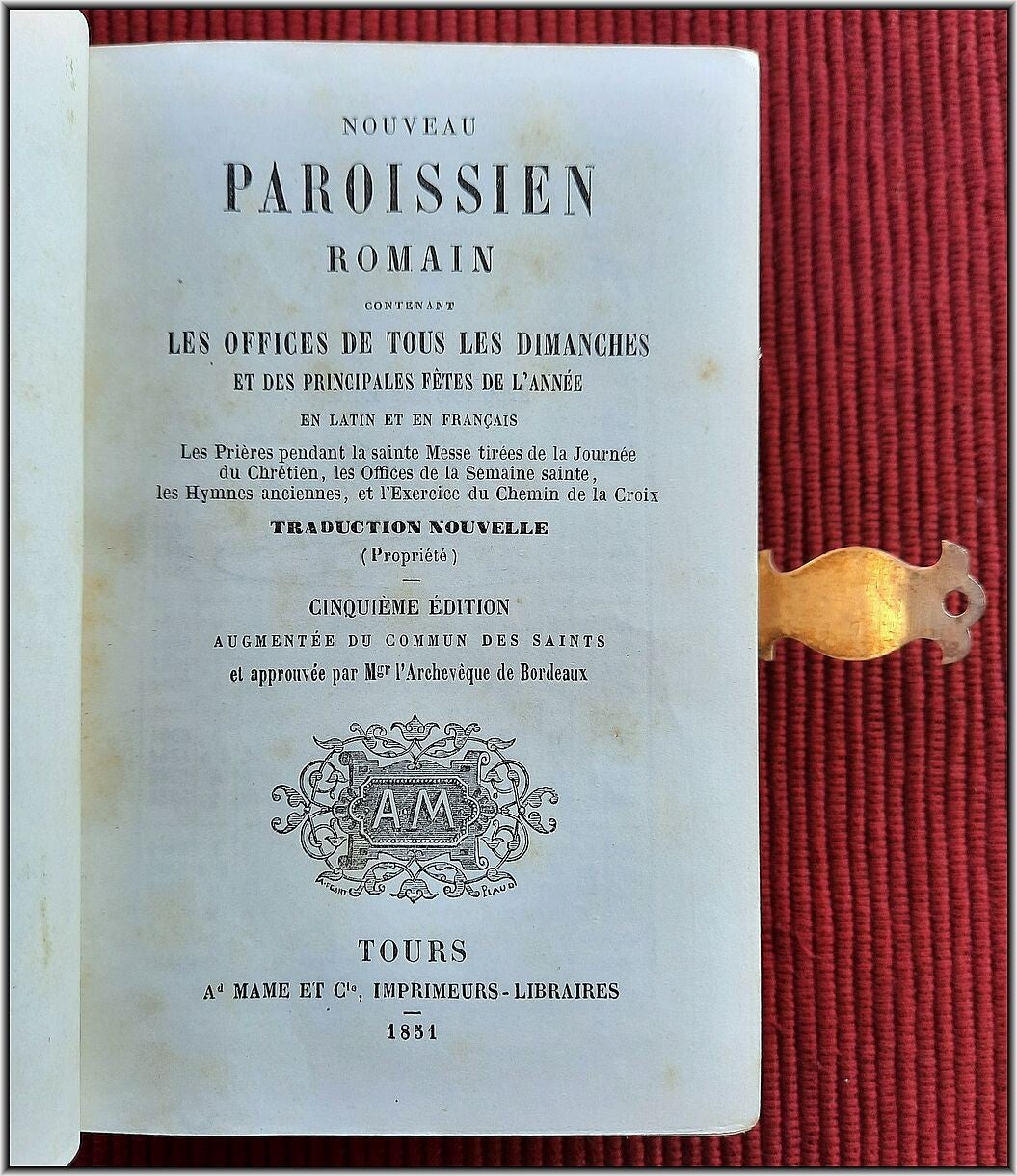 We are offering here a French Christian Catholic devotional book "Roman Parishioner" from 1851, with chromolithograph title page, engraved frontispiece and three engraved plates with Biblical motives drawn and engraved by Louis Joseph Hallez. With text in Latin & French.