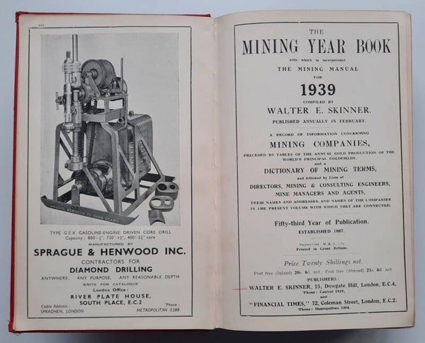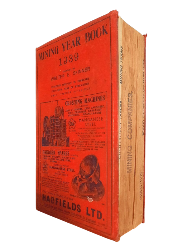 "The Mining Year Book with which is incorporated the Mining Manual for 1939."; London, Walter E. Skinner and Financial Times, 1939; 21 x 13 cm; Original red cloth; Collation complete - Title page, lxxii, 872 pages, [3] pages including adverts, further adverts interleaved; Binding is tight and firm, worn as usual for the age, boards and spine rubbed, cloth little tarnished, spine and boards extremities bumped. Text block/pages in very good condition, extremities of pages yellowed, but clean and very bright without foxing throughout except pages 445-470 which are wrinkly and affected by foxing. A few front and rear adverts pages also affected with foxing. Folding plates are whole and clean, overall in excellent condition for the age (see pics).