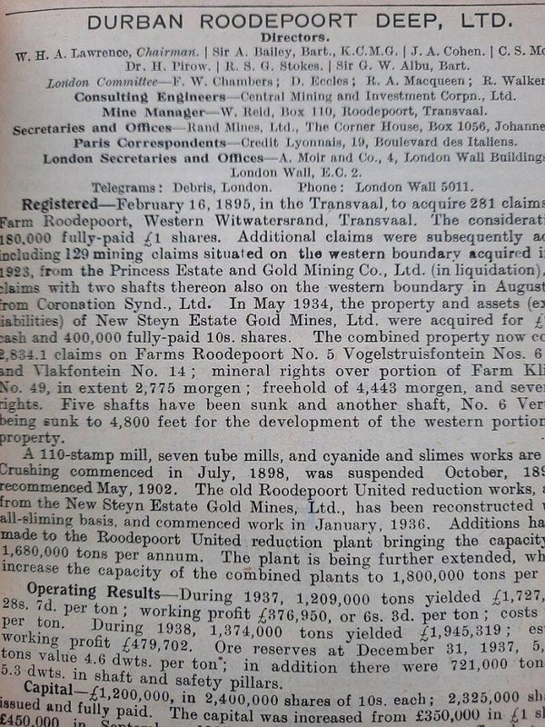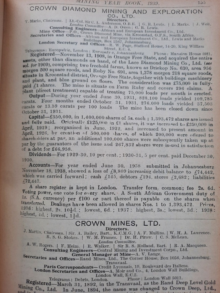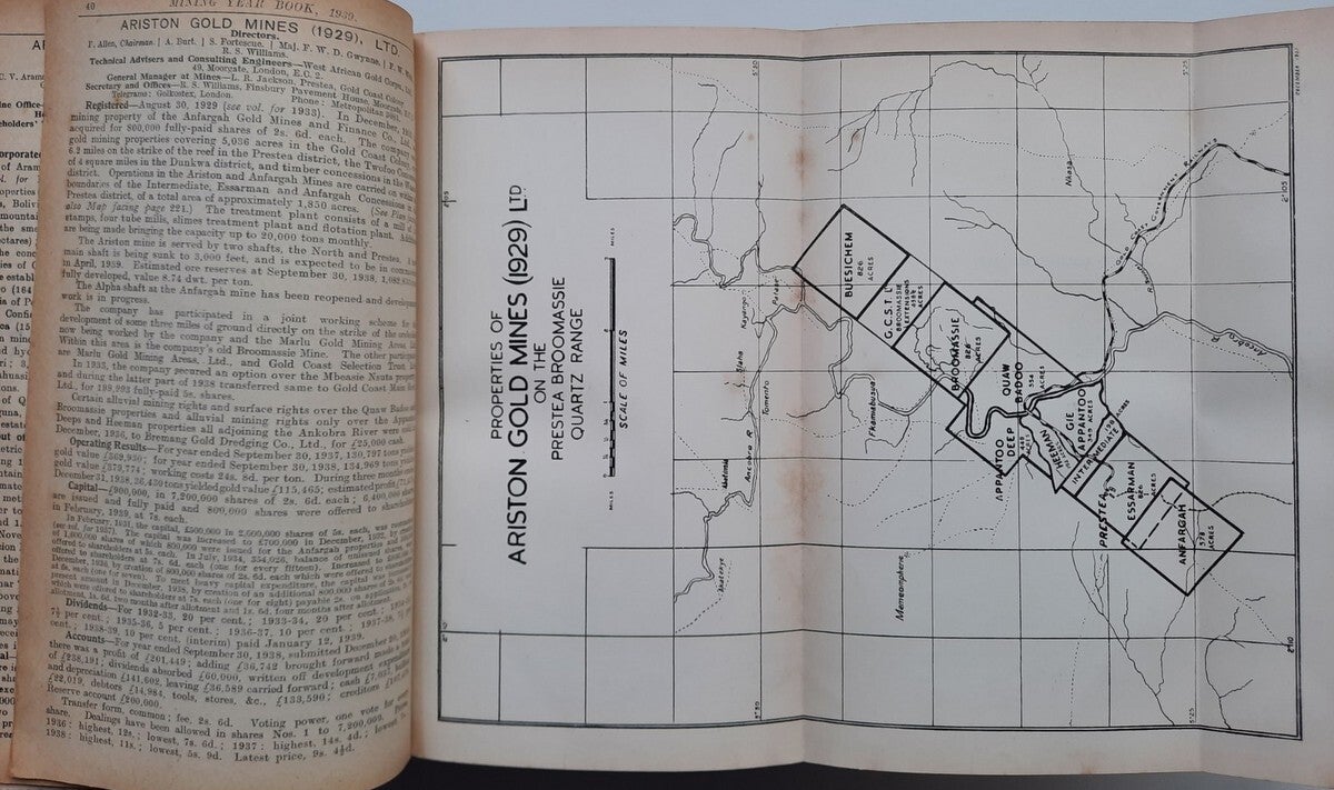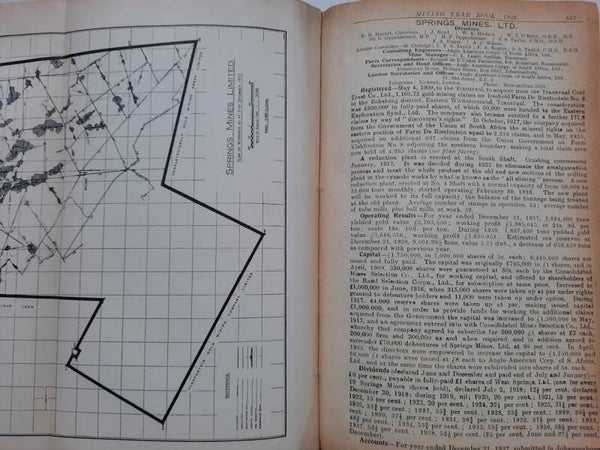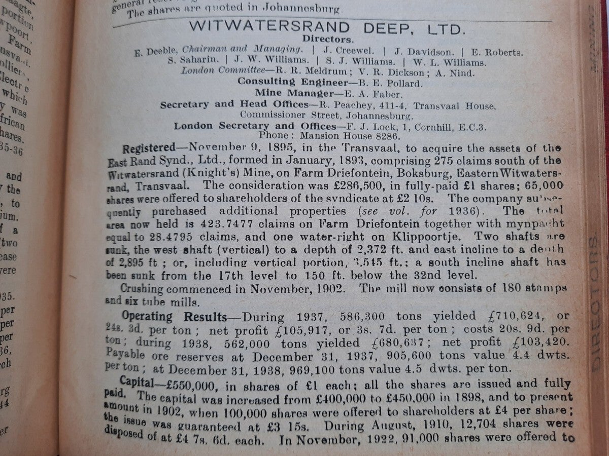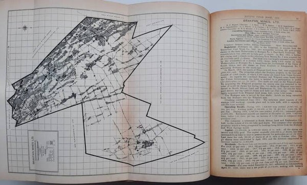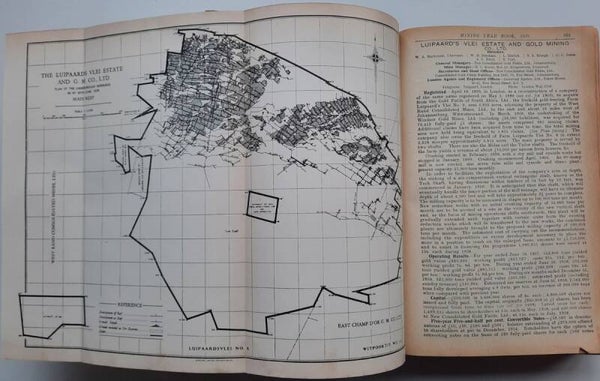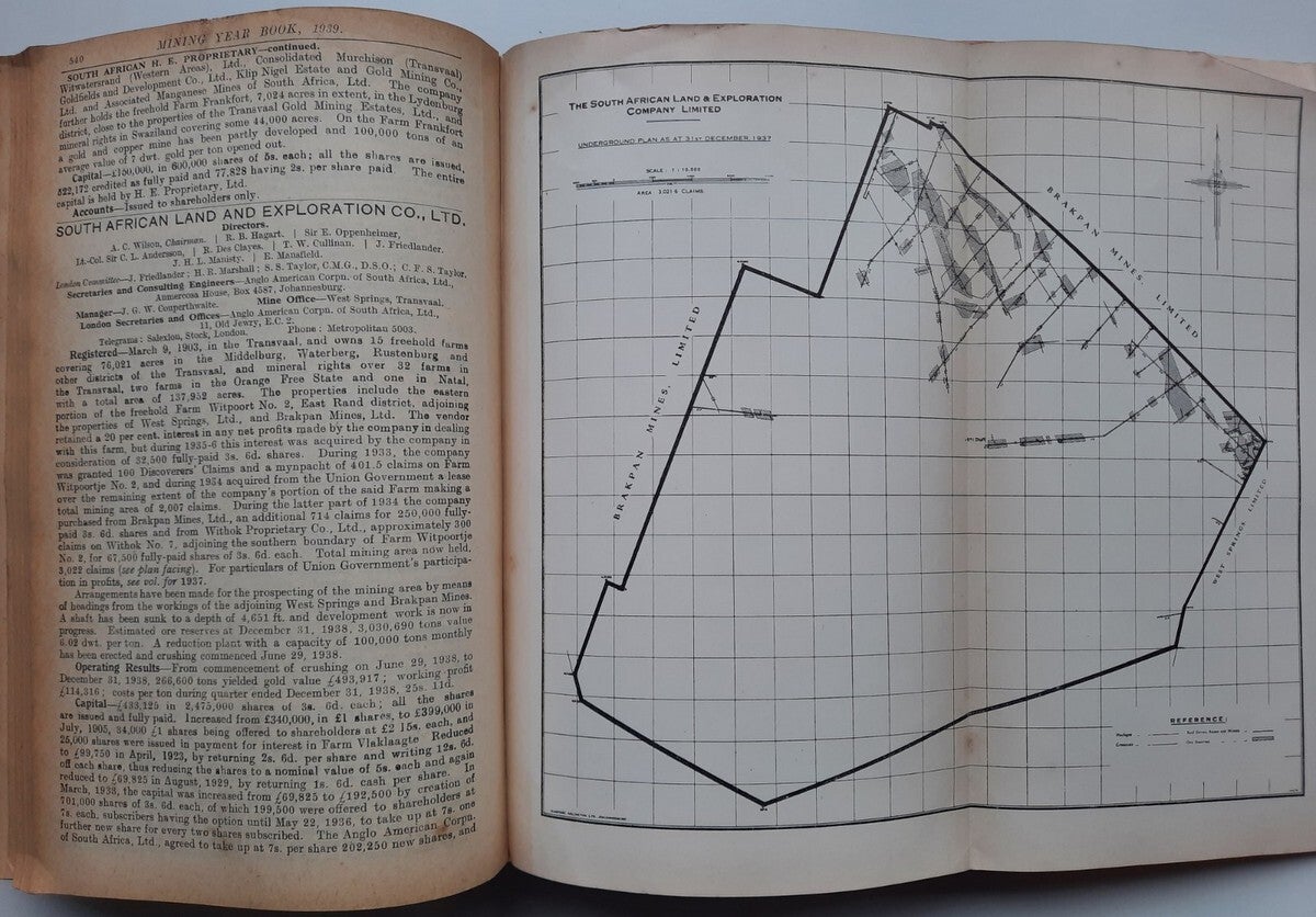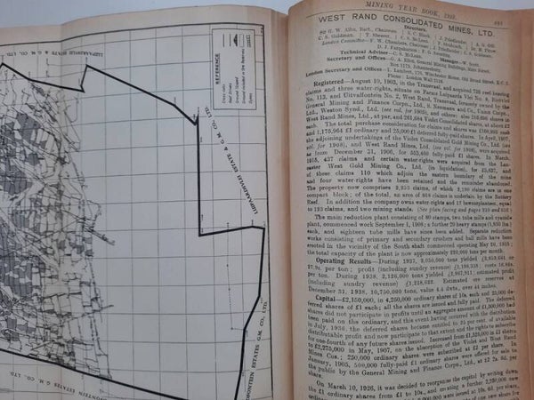 A comprehensive work with complete record of information concerning mining companies (including all from South Africa), proceded by total of 22 folding plates and numerous tables of the annual gold production of the World's Principal Goldfields. Including the 14 folding plates showing maps, plans, properties and mineral rights of Transvaal Mines (including General Plan of the Witwatersrand Goldfields of the Rand Mines, Ltd.) and numerous tables of the annual gold production of the World's Principal Goldfields (including the Transvaal and South Rhodesian Gold Output for 8 years). Contains also the complete list of Mining and Kindered Companies operating in all parts of the World, complete register of Directors of Mining Companies (with their addresses and the names of the Companies in the present volume with which they are connected), list of Mining & Consulting Engineers, Mine Managers and Agents (with addresses and names of Companies in the present volume for which they are act). With this volume is incorporated the Mining Manual for 1939.