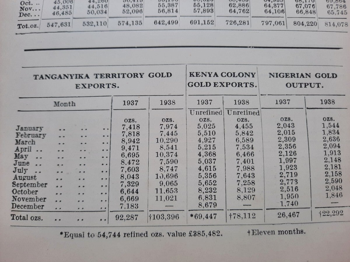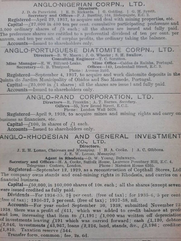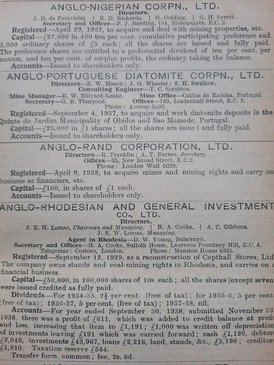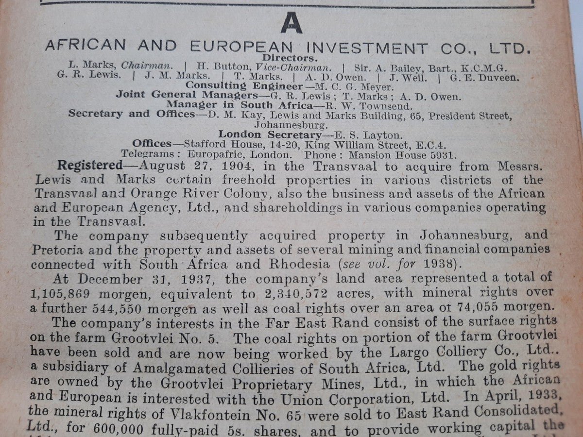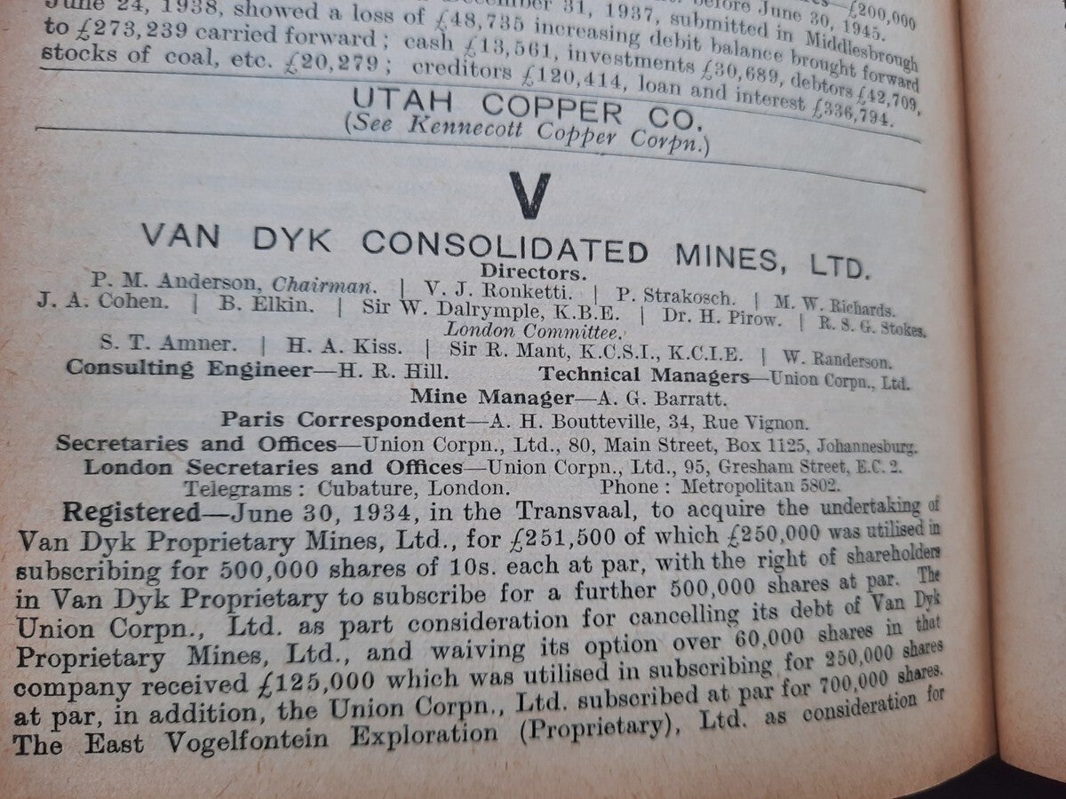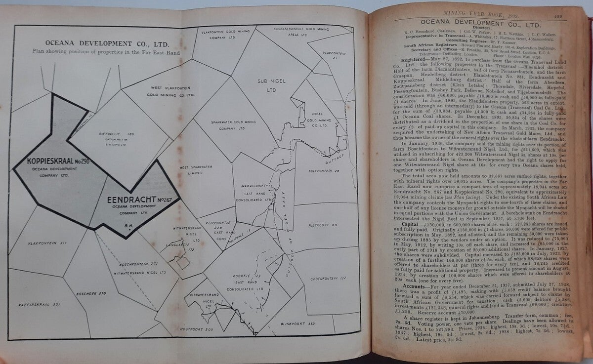 A comprehensive work with complete record of information concerning mining companies (including all from South Africa), proceded by total of 22 folding plates and numerous tables of the annual gold production of the World's Principal Goldfields. Including the 14 folding plates showing maps, plans, properties and mineral rights of Transvaal Mines (including General Plan of the Witwatersrand Goldfields of the Rand Mines, Ltd.) and numerous tables of the annual gold production of the World's Principal Goldfields (including the Transvaal and South Rhodesian Gold Output for 8 years). Contains also the complete list of Mining and Kindered Companies operating in all parts of the World, complete register of Directors of Mining Companies (with their addresses and the names of the Companies in the present volume with which they are connected), list of Mining & Consulting Engineers, Mine Managers and Agents (with addresses and names of Companies in the present volume for which they are act). With this volume is incorporated the Mining Manual for 1939.
