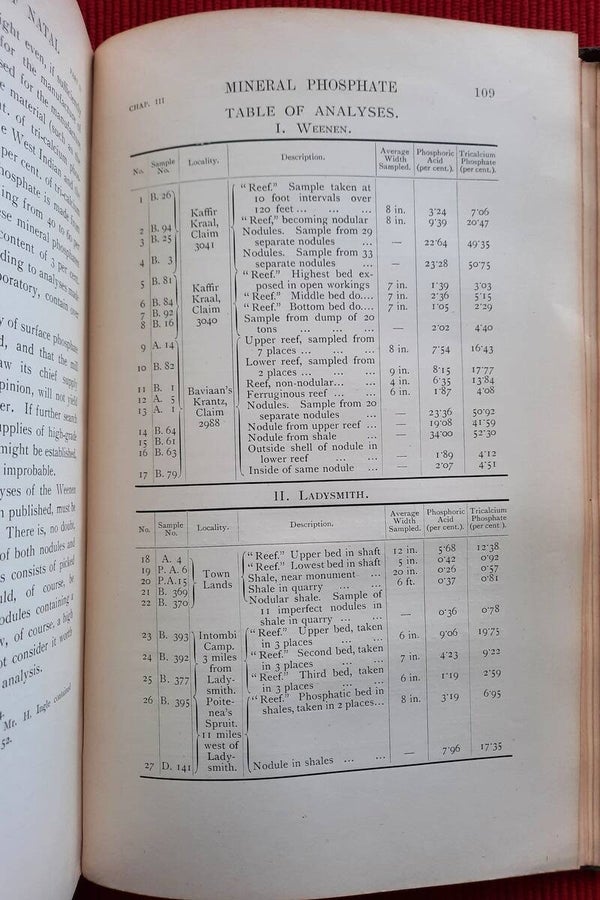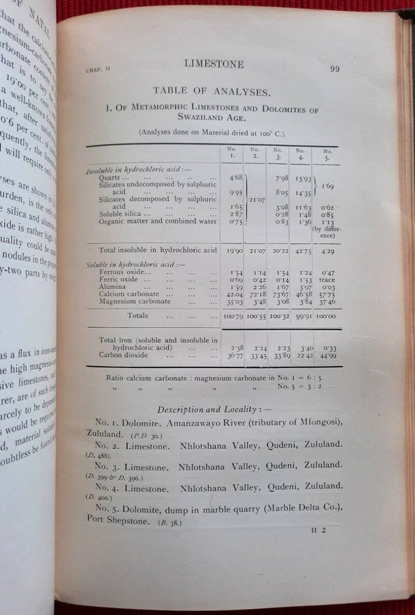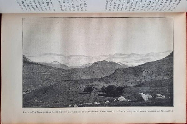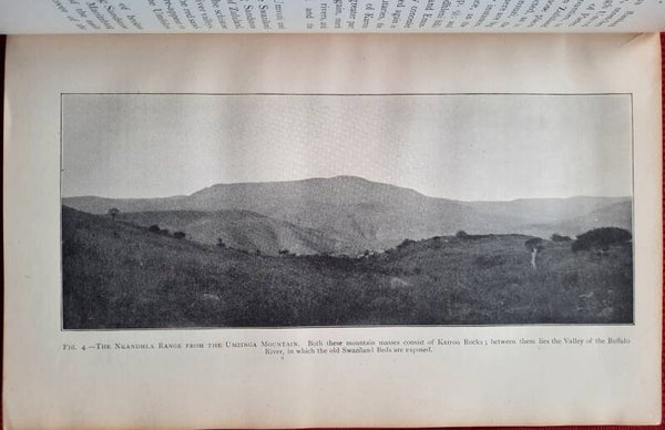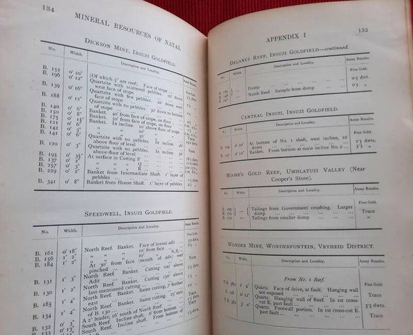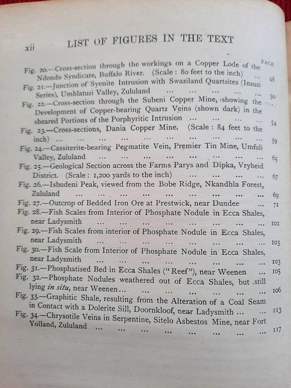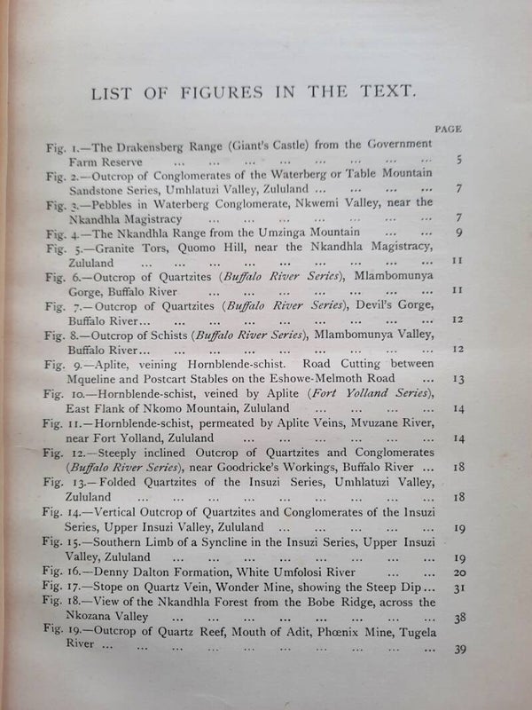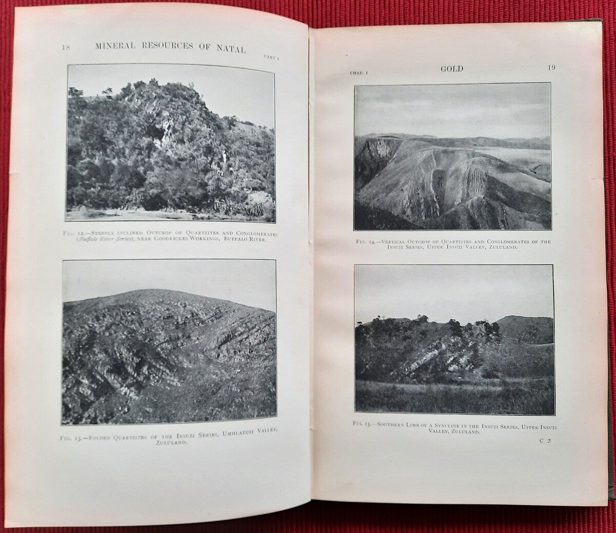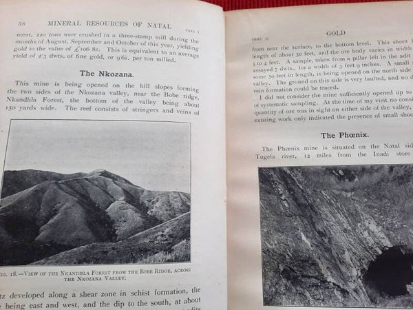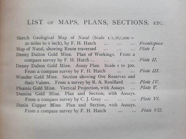 "Report on the mines and mineral resources of Natal. (Other than coal). Published by Order of the Natal Government."; Richard Clay and Sons, Limited, London, 1910; First Edition; 25 x 16 cm; Original green cloth hardover; Text in English; Collation complete - Title page, Multiple folding color map in frontispiece, 155 pages, with 7 plates at the rear (of which one is multiple folding map) and 34 text figures; Binding is stable, tight and firm, with usual shelf wear, covers slightly soiled and with some discoloration. Boards and spine with slight rubbing, extremities and corners bumped. Cloth little frayed to the joints at few places, othervise hinges and joints are whole and stabile. Both free endpapers and paste downs with some age tanning. Pages/text block very clean and bright, with some yellowing, no foxing or markings throughout except a few small and light foxing dots to the title page and two maps and plates. A sound copy of this scarce book.