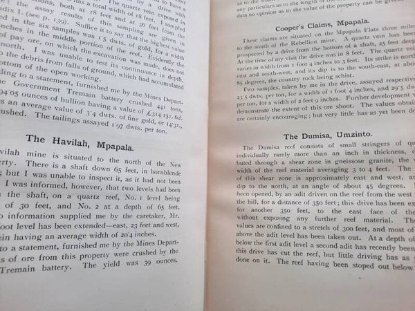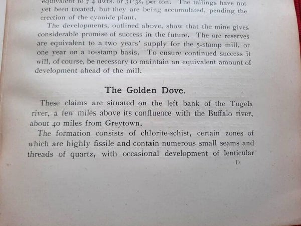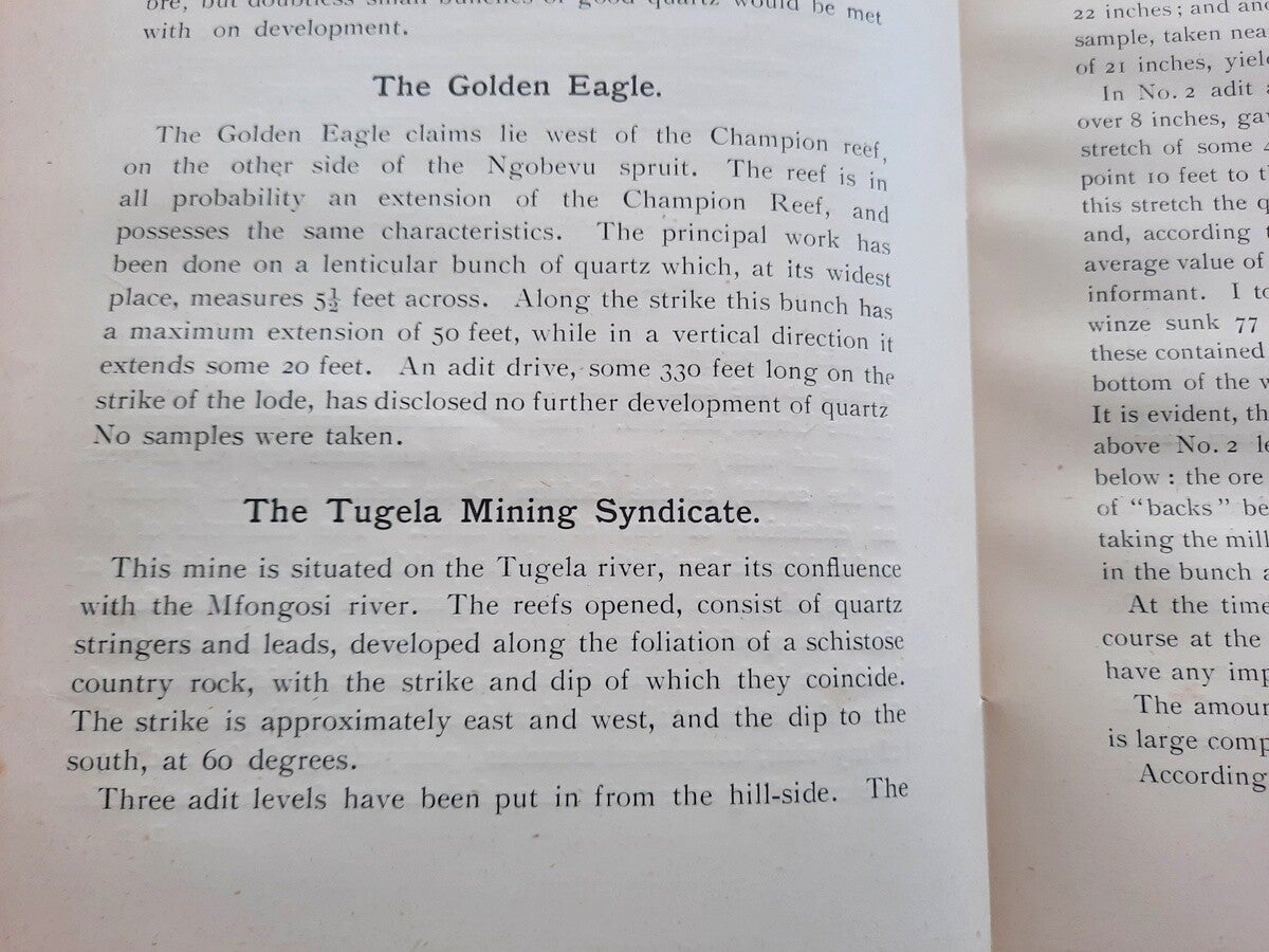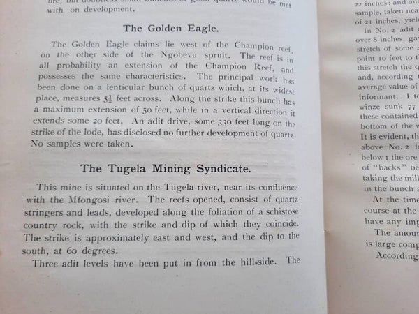 - Chapter II. which contains: Quartz Veins occurring in, and of subsequent origin to, the Schists and Granites of Swaziland Age; The Wonder. The Golden Dove; The Champion Reef; The Golden Eagle. Tugela Mining Syndicate; The Nkozana; The Phœnix; The Rebellion; The New Year. The Havilah; Cooper's; The Dumisa. The Golden Butterfly; Royston's; Summary).