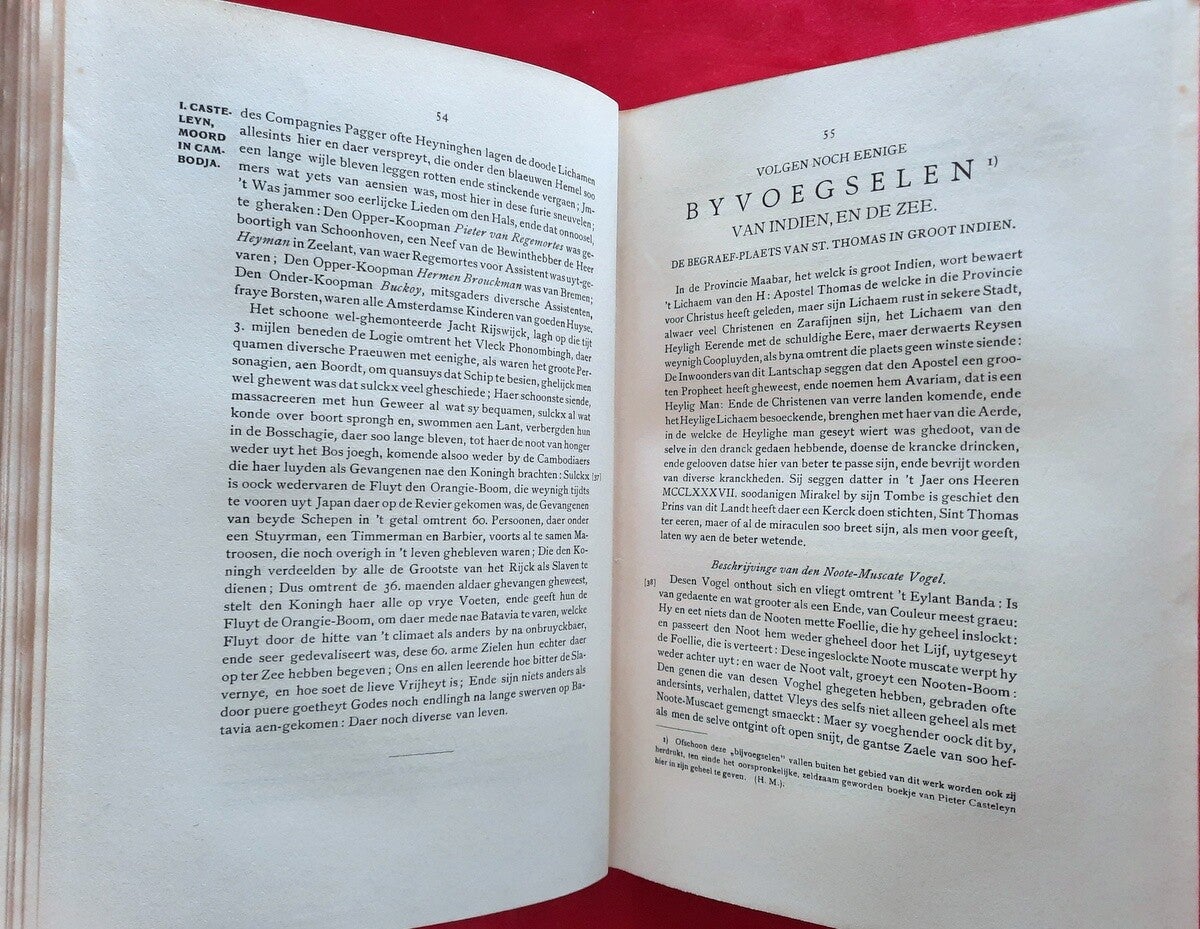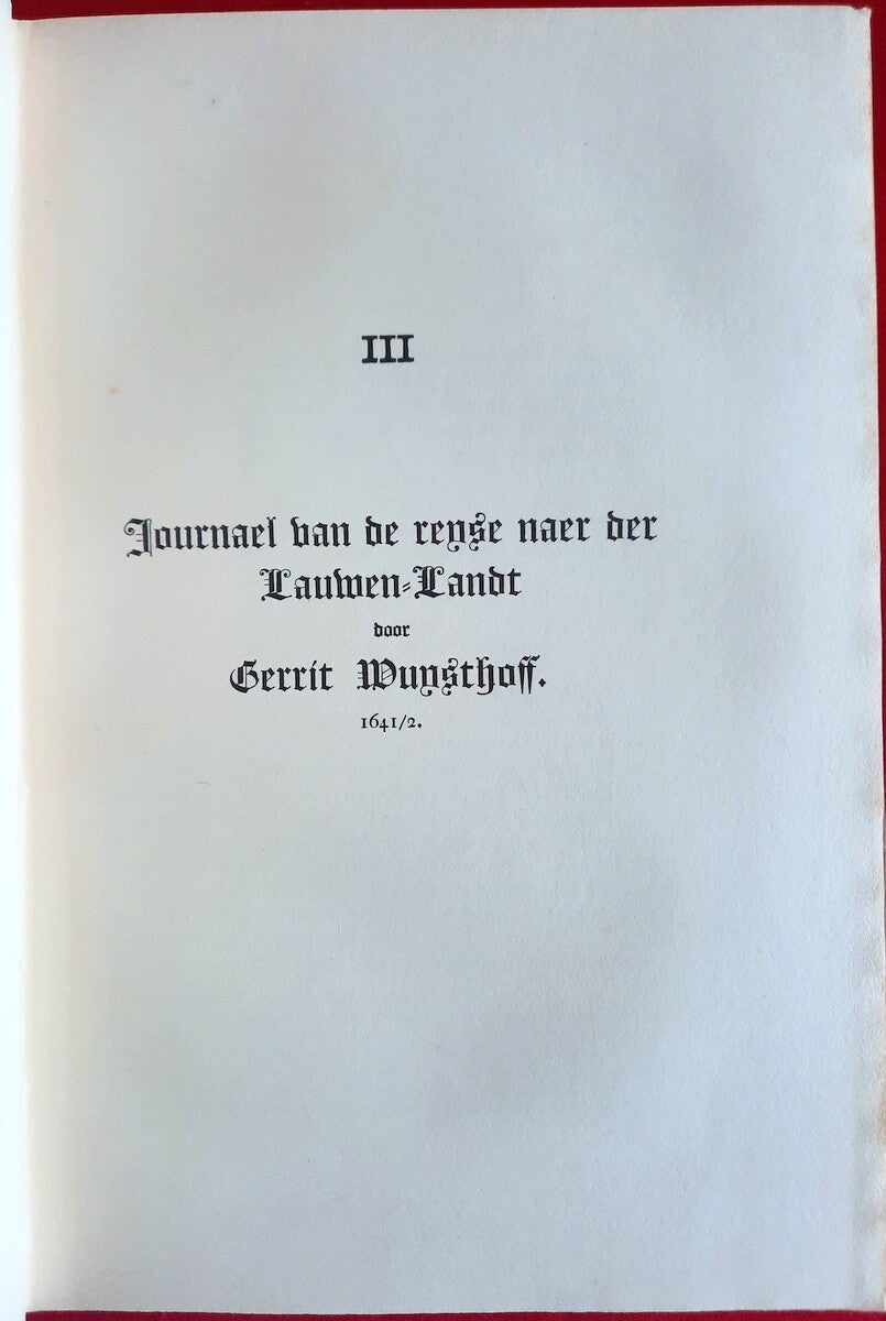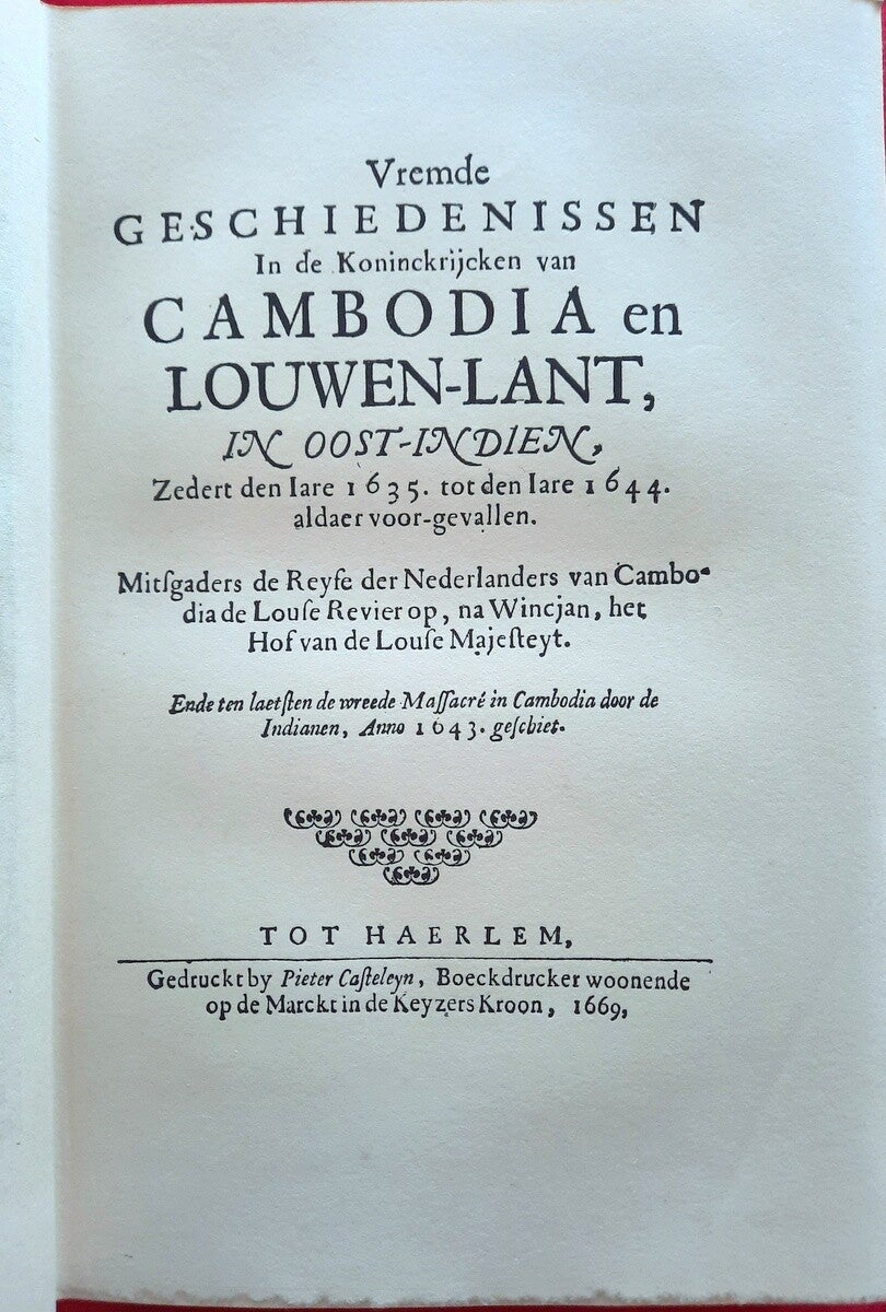 This scarce volume compiled by Dr. Hendrik Muller includes a reproduction of the famous "Strange Histories in the Kingdoms of Cambodia and Laos, in the East Indies, since the year 1635 to the year 1644, as they happened there" (Haarlem, Pieter Casteleyn, 1669), about the journey Gerrit van Wuysthoff made from Cambodia to Laos, with the original engraved title page and the text of which is reproduced, including a map and two folding plates.