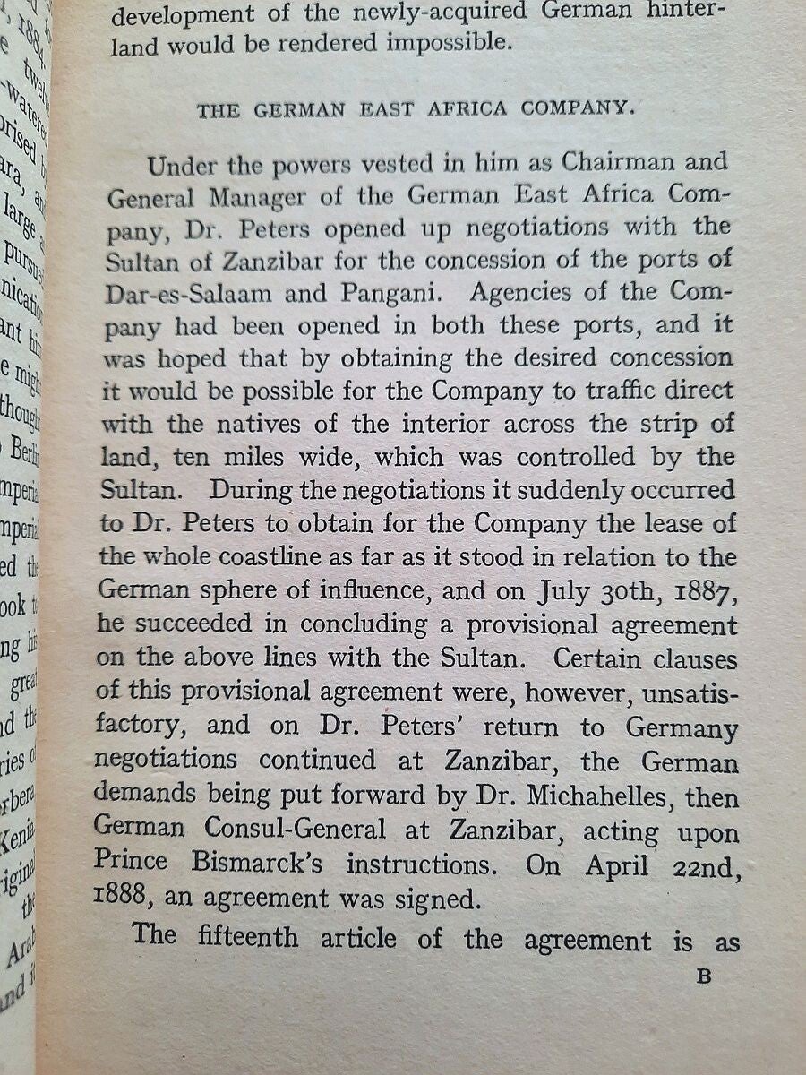 "The creation of a German colony in East Africa was the conception of a private individual, and he embarked upon the enterprise with a privately subscribed capital of less than £10,000. The scheme was submitted to Prince Bismarck, who not only refused his support, but went out of his way to announce that the State would not be responsible for the life of the private individual or for the safety of any property he might acquire on the African mainland opposite the Island of Zanzibar. Why should the Imperial Chancellor, who was responsible for the seizure of South-West Africa, the Cameroons and Togoland, have been so scrupulously careful to discountenance any extension of Germany's African Empire on the East Coast? It may be that he had no faith in Dr. Carl Peters, and anticipated the failure of his mission, or he may have felt that it was too soon to reveal his designs regarding a region in which British influence was paramount. Whichever explanation may be correct, Bismarck washed his hands of the intrepid adventurer and his affairs, and called Europe to witness the correctness of his attitude. He unbent somewhat towards Dr. Peters when he returned to Berlin in 1885 with a sheaf of treaties, which caused him to be recognised as the lessor of a territory as large as Southern Germany, and the Imperial Charter which was conferred upon his German East Africa Company shortly afterwards bore the signature of Bismarck under that of the Emperor...