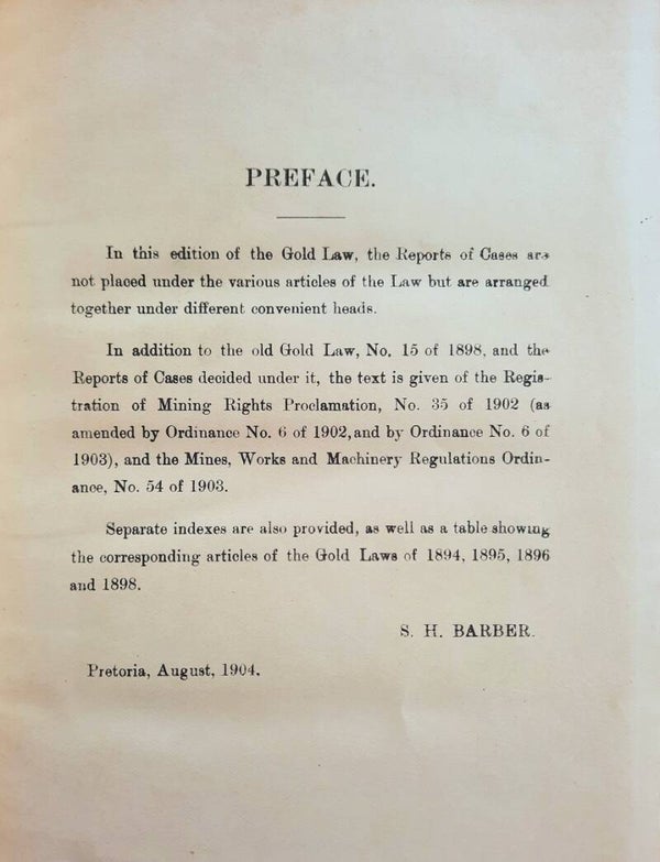 In addition to the old Gold Law, No. 15 of 1898, and the Reports of Cases decided under it, the text is given of the Regis tration of Mining Rights Proclamation, No. 35 of 1902 (as amended by Ordinance No. 6 of 1902, and by Ordinance No. 6 of 1903), and the Mines, Works and Machinery Regulations Ordin- ance, No. 54 of 1903.