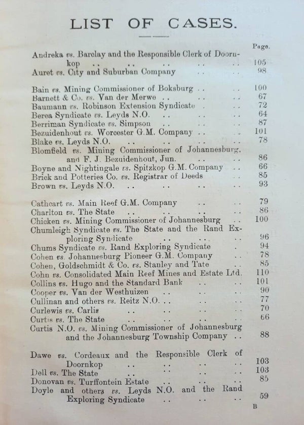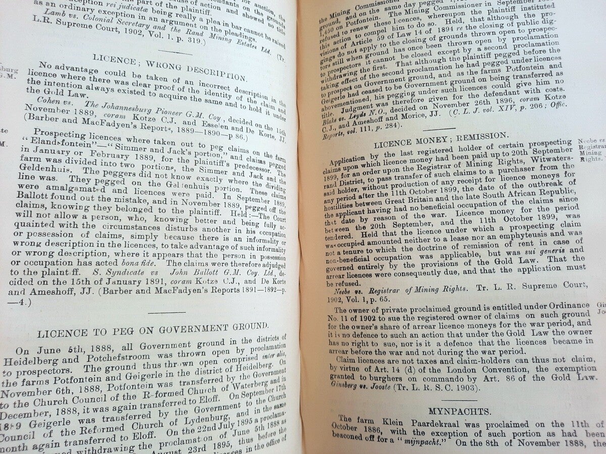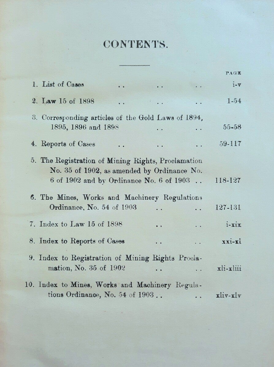 Translation into English of Law No. 15 of 1898 together with Reports of Cases decided under the Law, and the Registration of Mining Rights Proclamation No. 35 of 1902, as amended by Ordinance No. 6 of 1902 and Ordinance No. 6 of 1903, and The Mines, Works and Machinery Regulations Ordinance No. 54 of 1903, with separate Indexes.