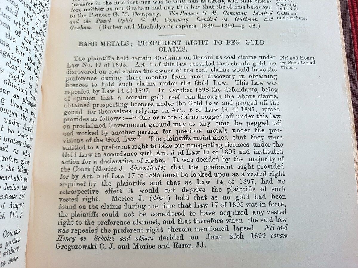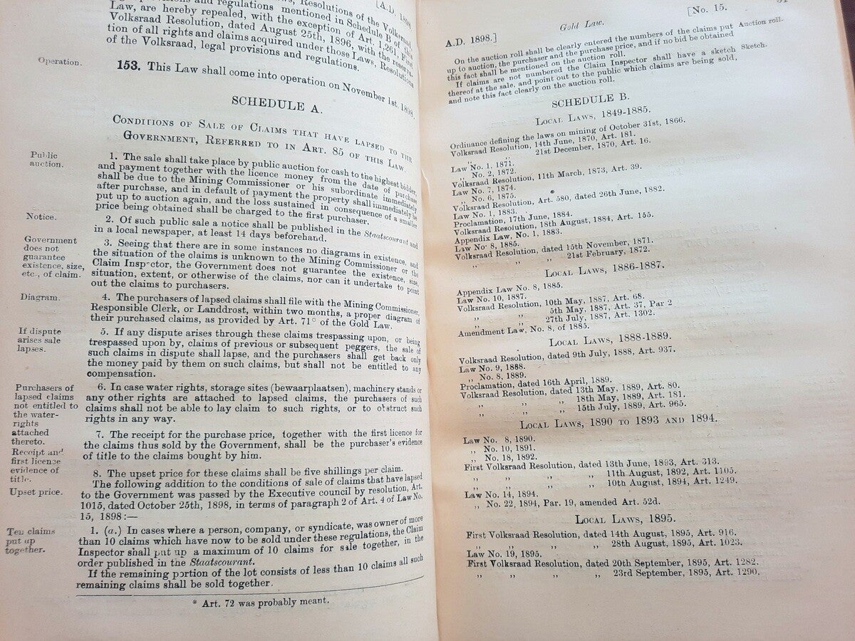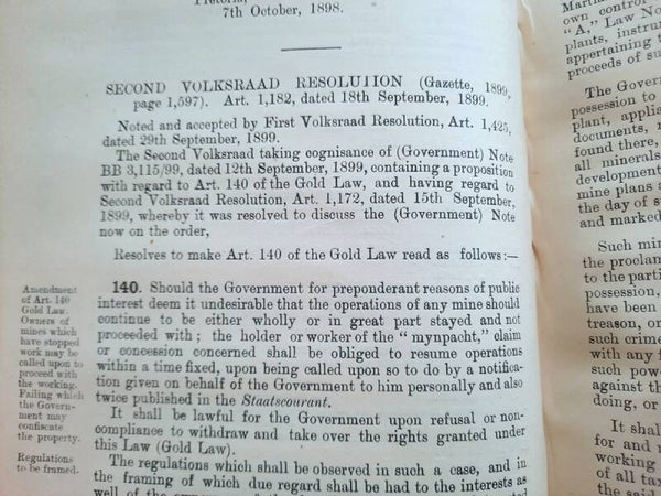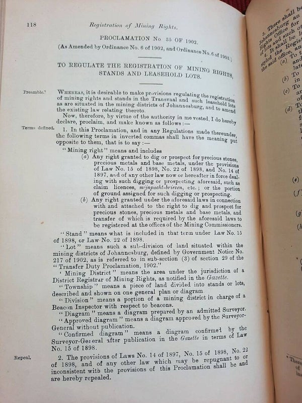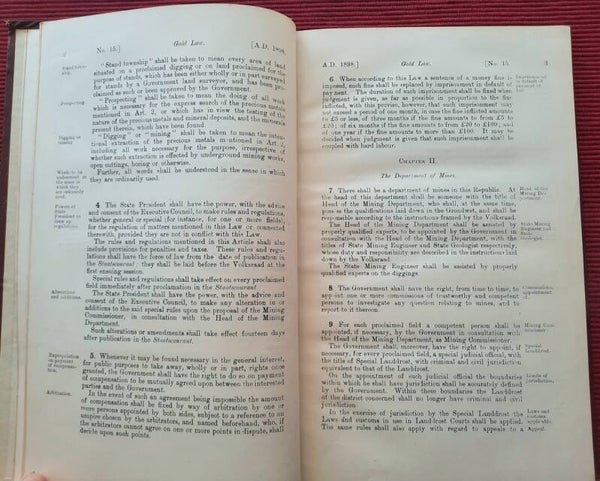 A scarce collection of mining laws including a translation into English of the Law No.15 of 1898 with reports of cases, Registration of Mining Rights of 1902, Mines, Works & Machinery Regulations from 1903, etc.