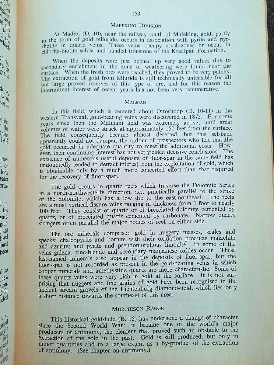 SECTION II - PRECIOUS METALS AND STONES (with chapters - DIAMONDS - History; Diamondiferous Deposits: Witwatersrand Conglomerate, Deposits in Kimberlite, Alluvial Deposits; Artificial Substitutes for Diamond; Economic Factors; GEM-STONES OTHER THAN DIAMONDS; GOLD - GOLD IN THE WITWATERSRAND AND ADJACENT SYSTEMS: The Heidelberg Area, The Klerksdorp Area, The Vredefort Area, The Odendaalsrus-Virginia Area, The Kinross Area; Mineralogy of the Reefs; Origin of the Deposits; Mining and Production of Gold; OTHER GOLD OCCURRENCES - Alluvial Gold; Barberton; Bochum; Central Transvaal; Eersteling and Mount Maré; Harlequin Mine; Klein Letaba; Mafeking Division; Malmani; Murchison Range; Natal and Zululand; Northwestern Transvaal; Gold Occurrences in the Pilgrim's Rest, Kaapsehoop, Sabie, Lydenburg and Machadodorp Areas; Schweizer-reneke District; Storms River-mouth; Waaikraal; PRODUCTION FIGURES; PLATINUM METALS; SILVER);